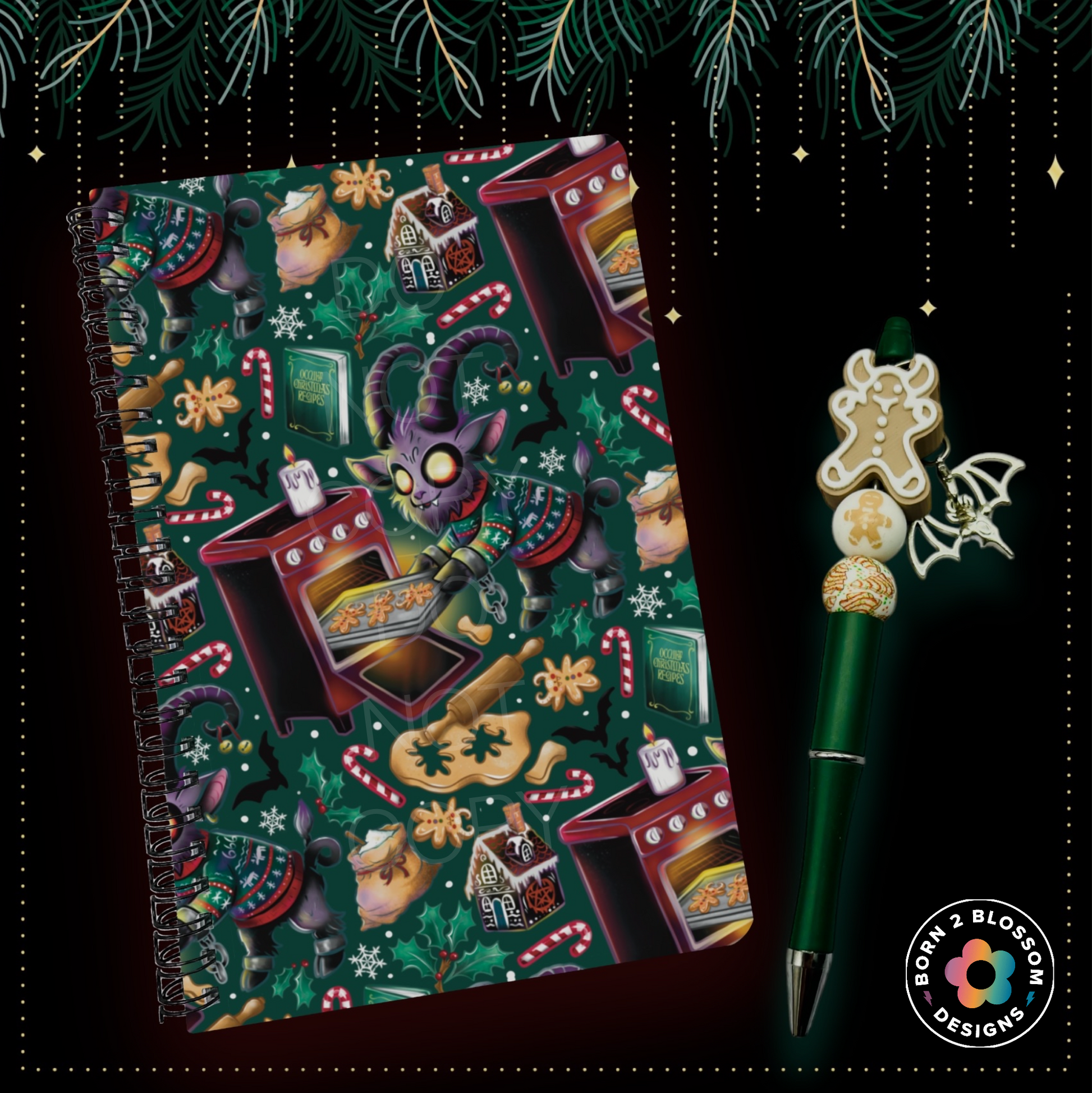 Gorgeous holiday pattern of Krampus baking cookies, paired with a Krampus cookie pen!