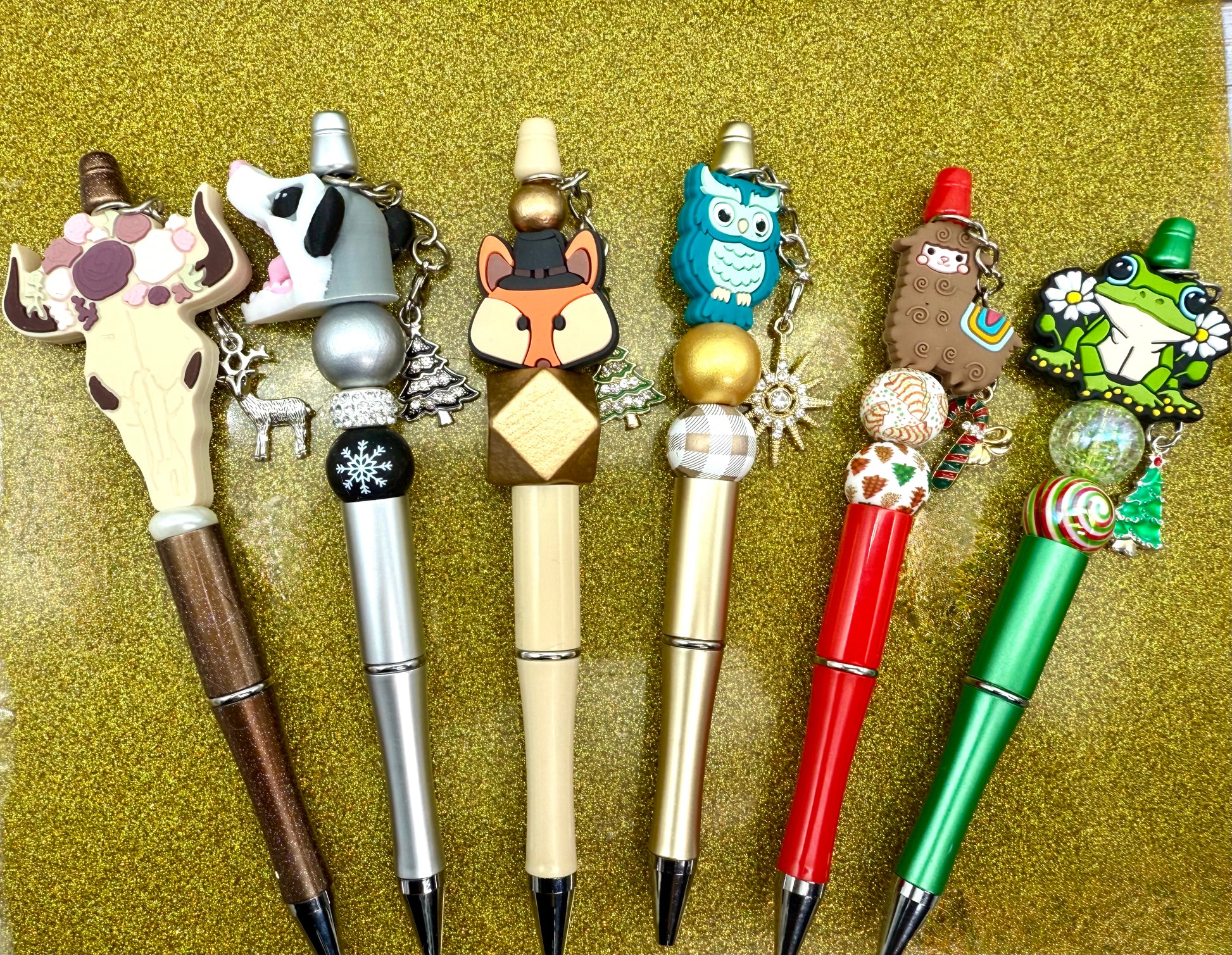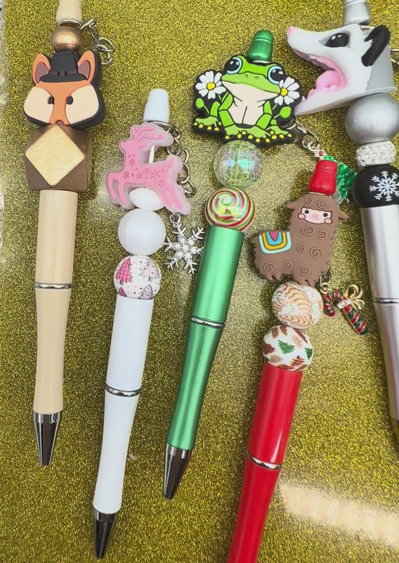 Beautiful beaded pens featuring cute critters:  deer, frogs, snails, opossum, owls, alpacas, snails, fox, ducks, cats.