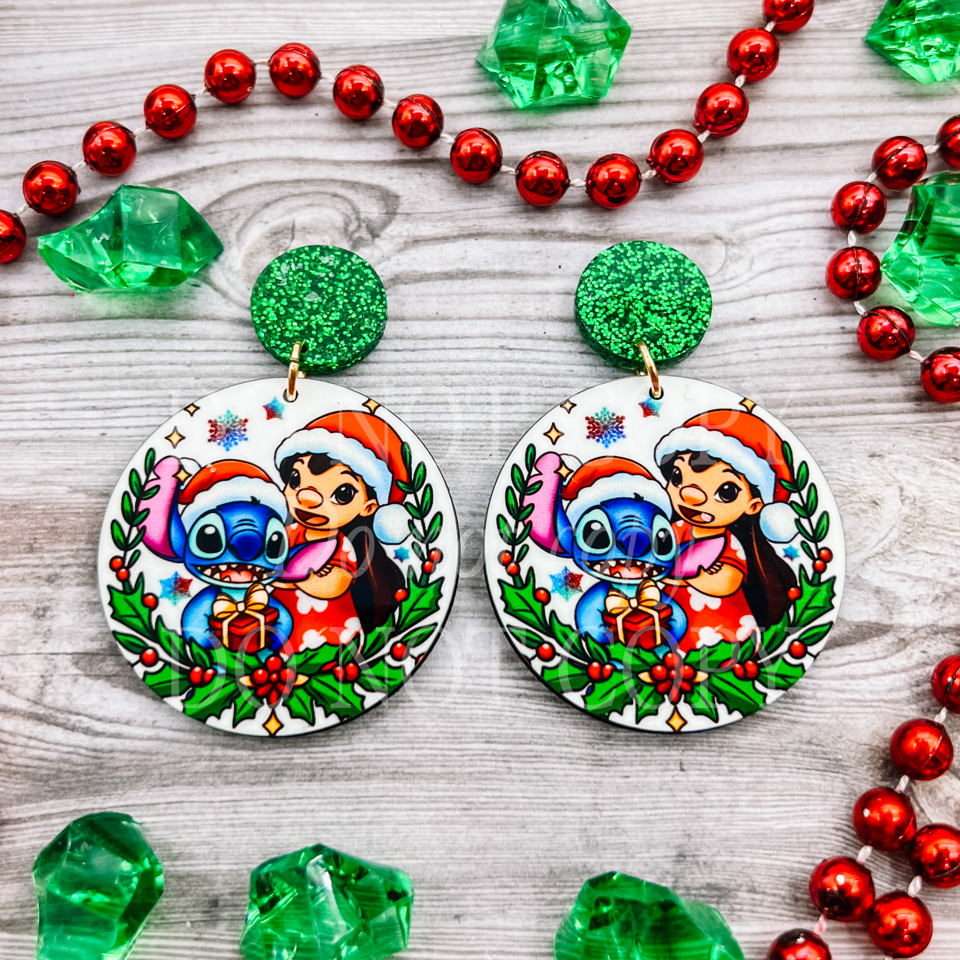 These lightweight Christmas earrings measure 1.7” long, not including the green glitter circle posts.
