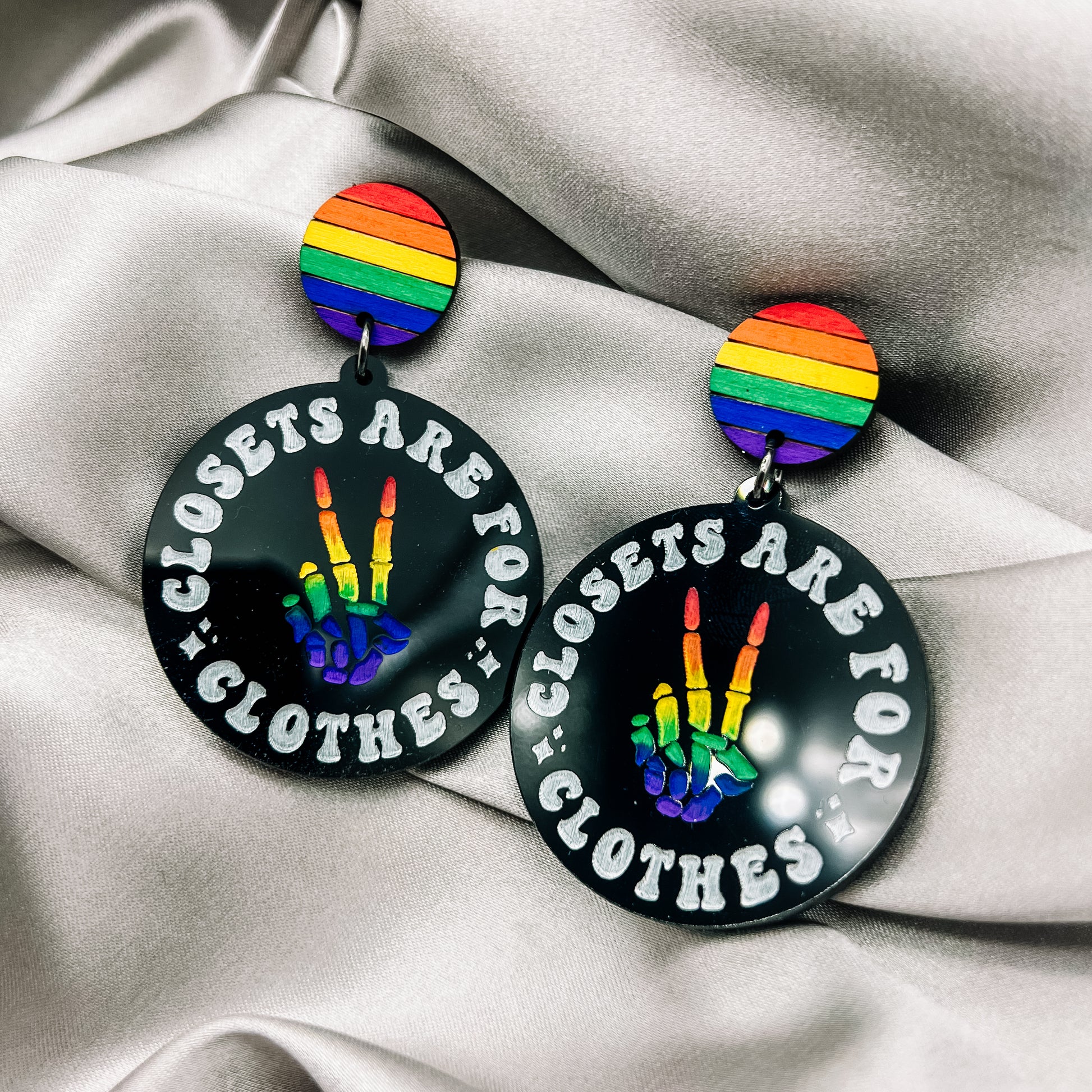 Laser cut acrylic Pride earrings. Hand painted circle post and hand painted glossy black material! Perfect for Pride month and all year round! Send me a message if you’d like different Pride flag colors!