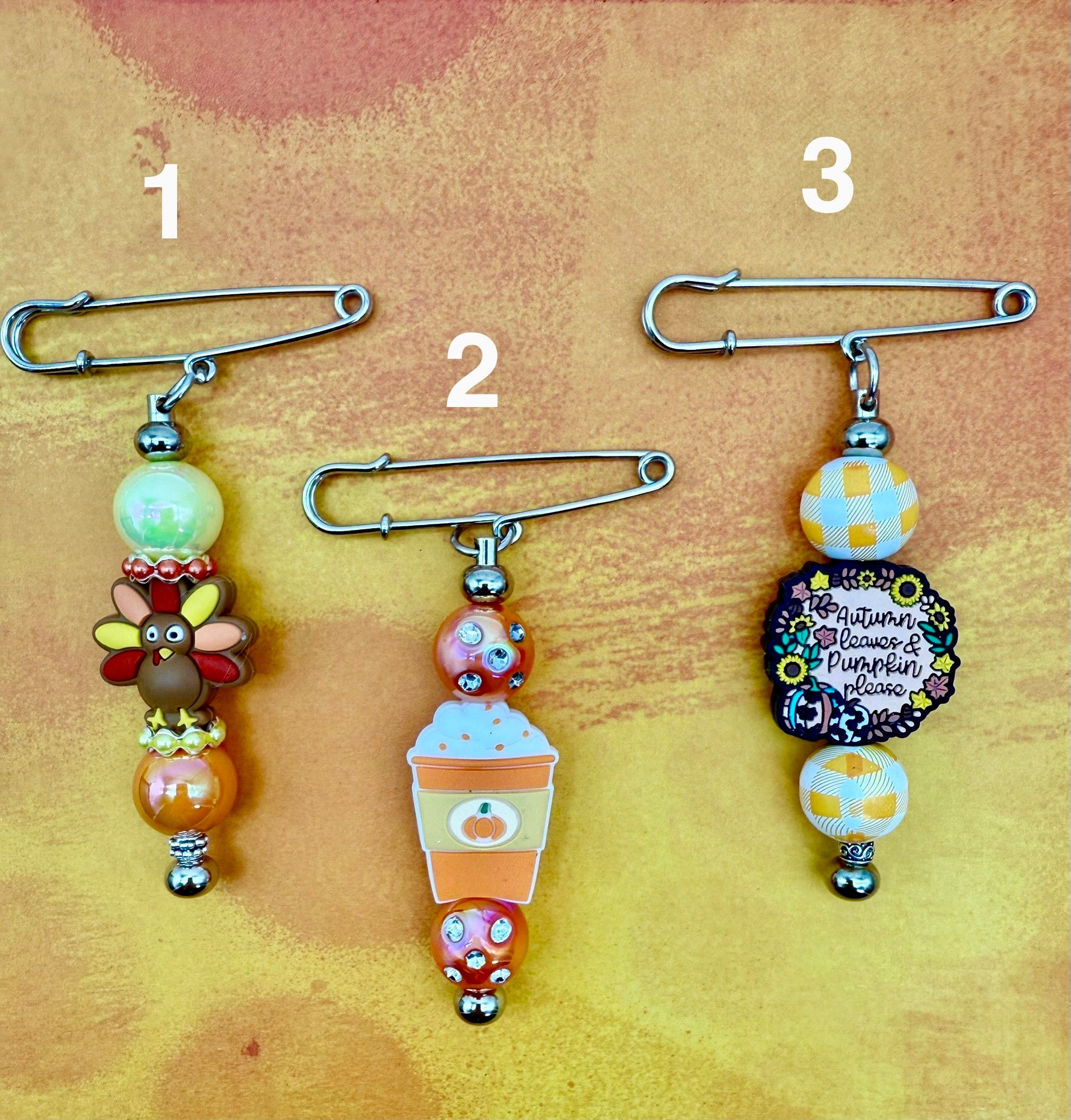 Fall/Thanksgiving theme featuring on our newest item:  beaded safety pin brooches. Bead bar drop 3”.