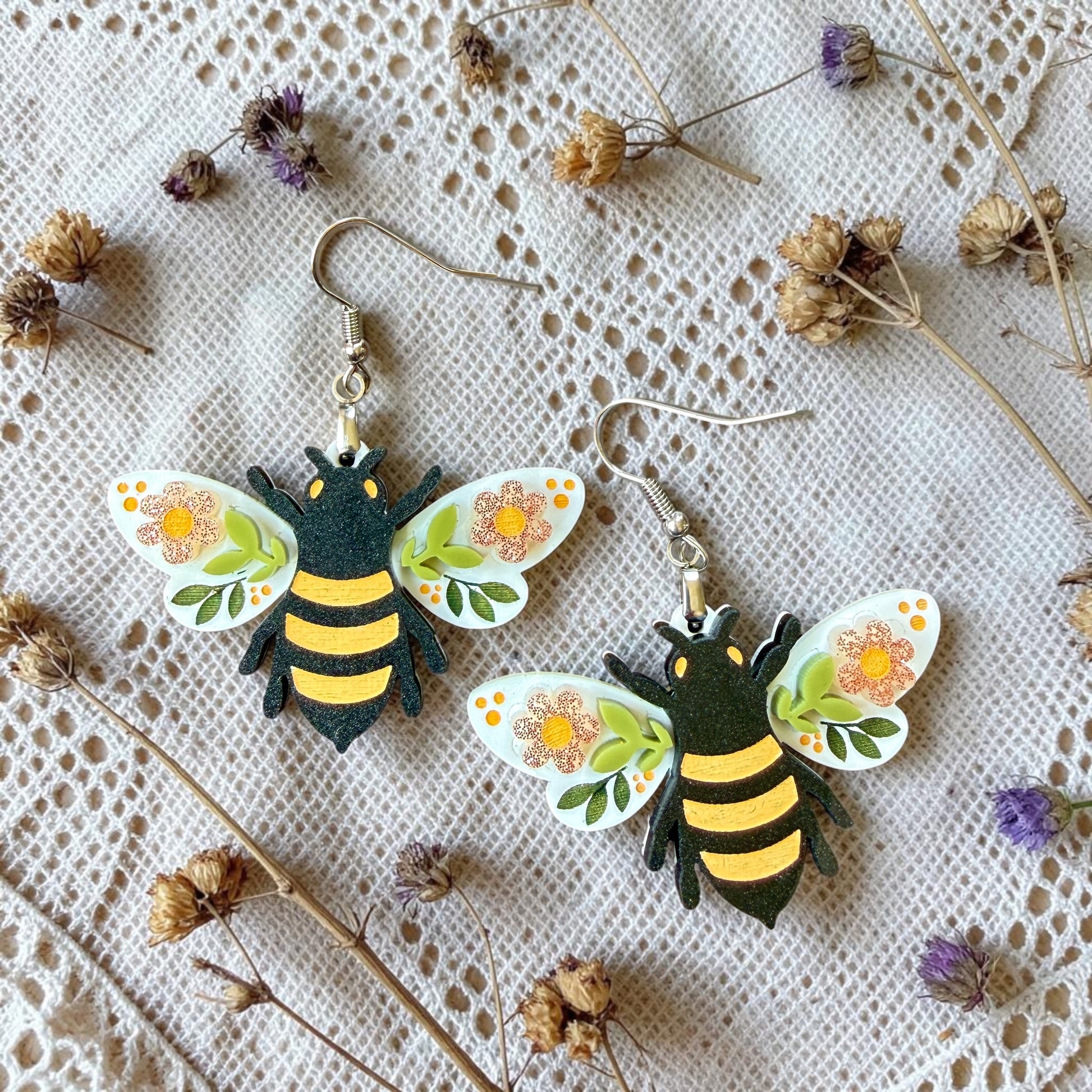 These lightweight floral bee earrings measure 1.4” inches long not including the hooks.
