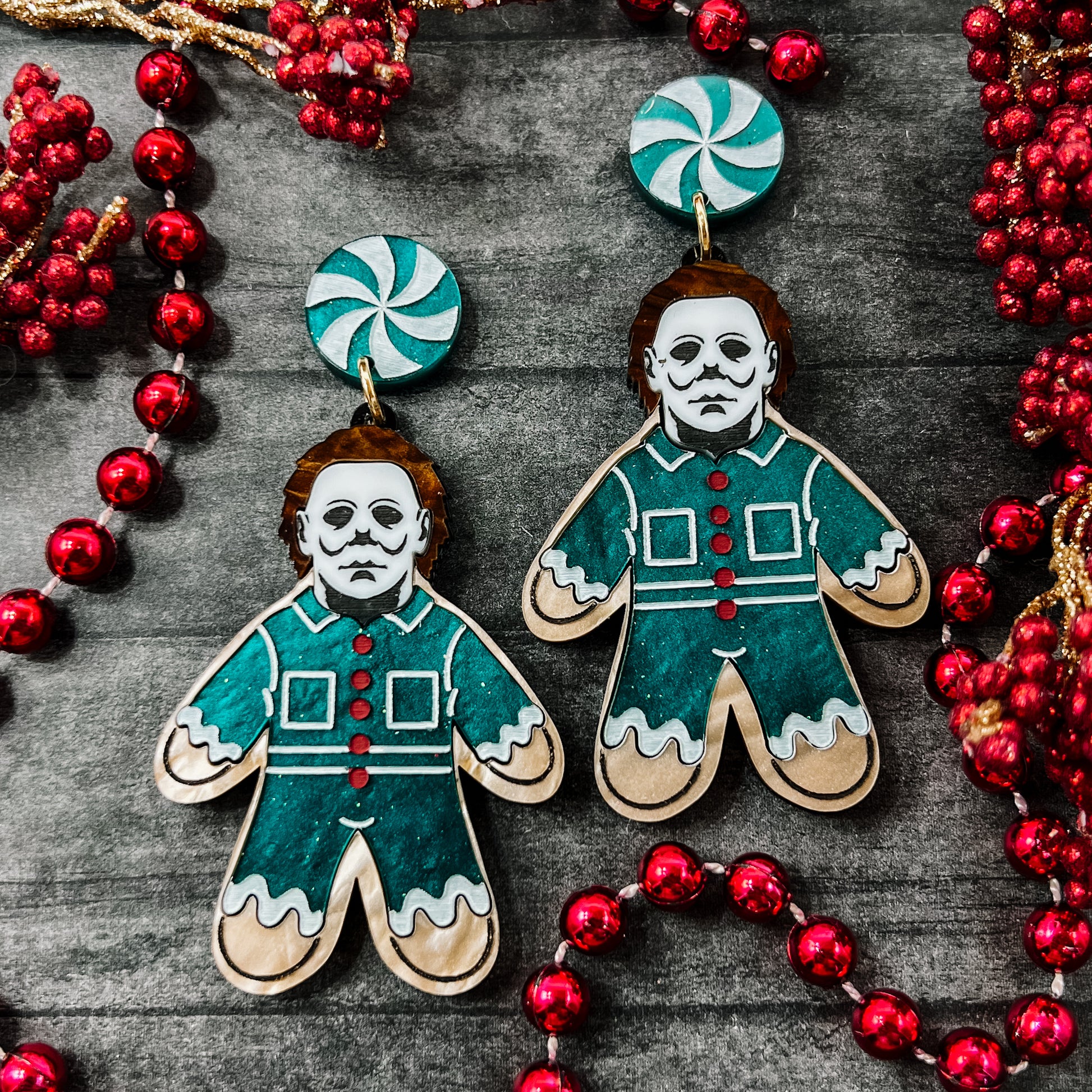 Michael Myers as a gingerbread cookie π€£ Cut from various acrylics. These earrings are 2.25β long not including the peppermint post Β