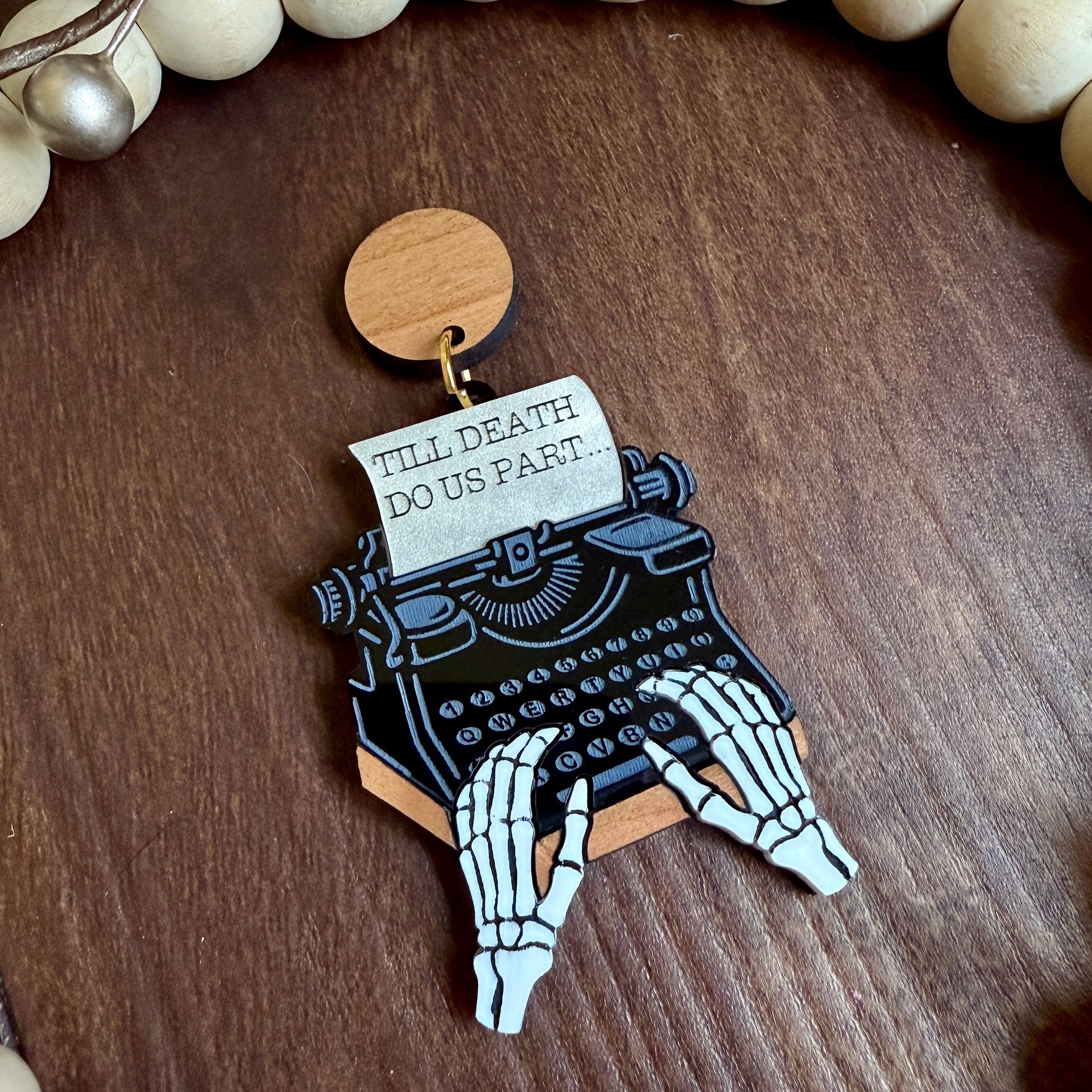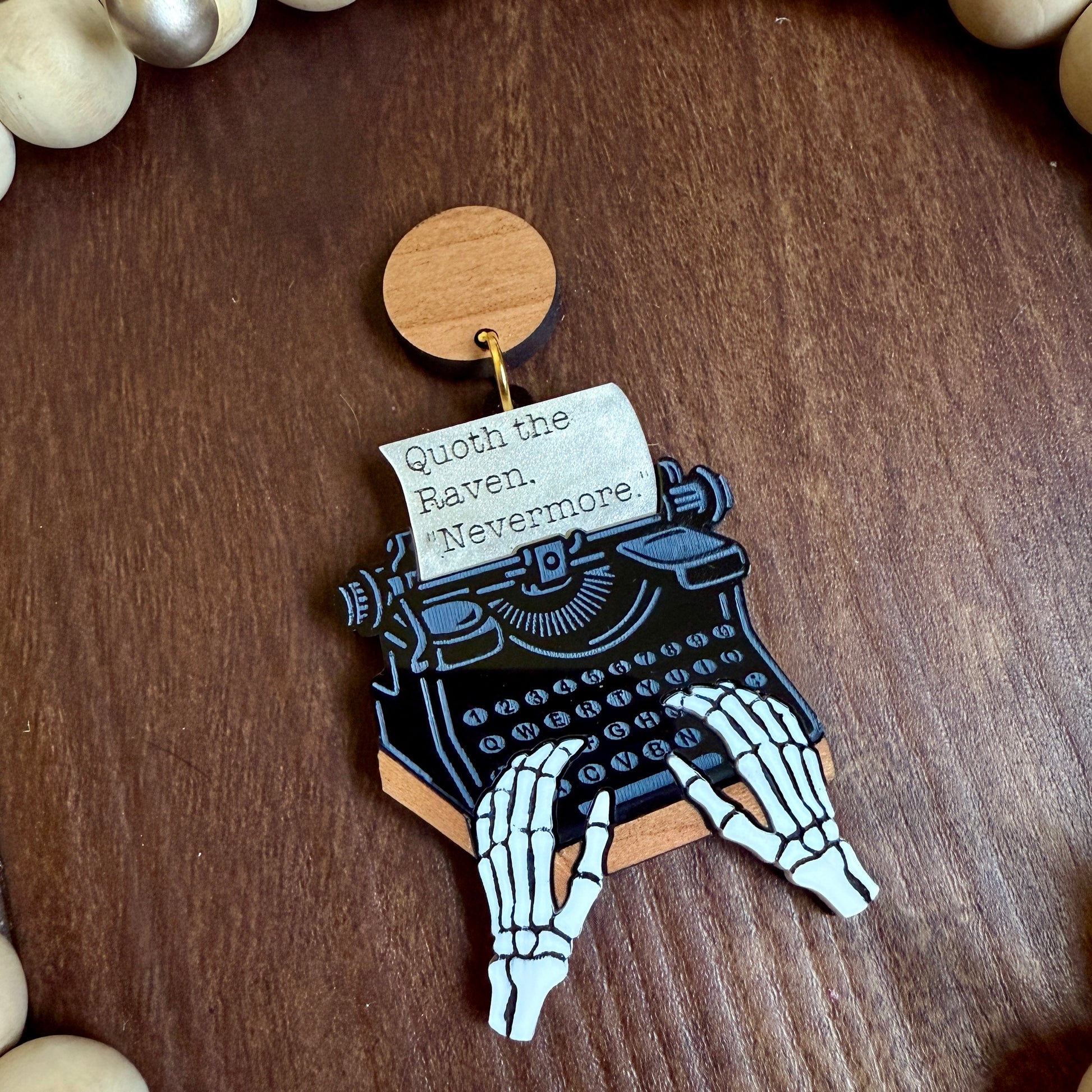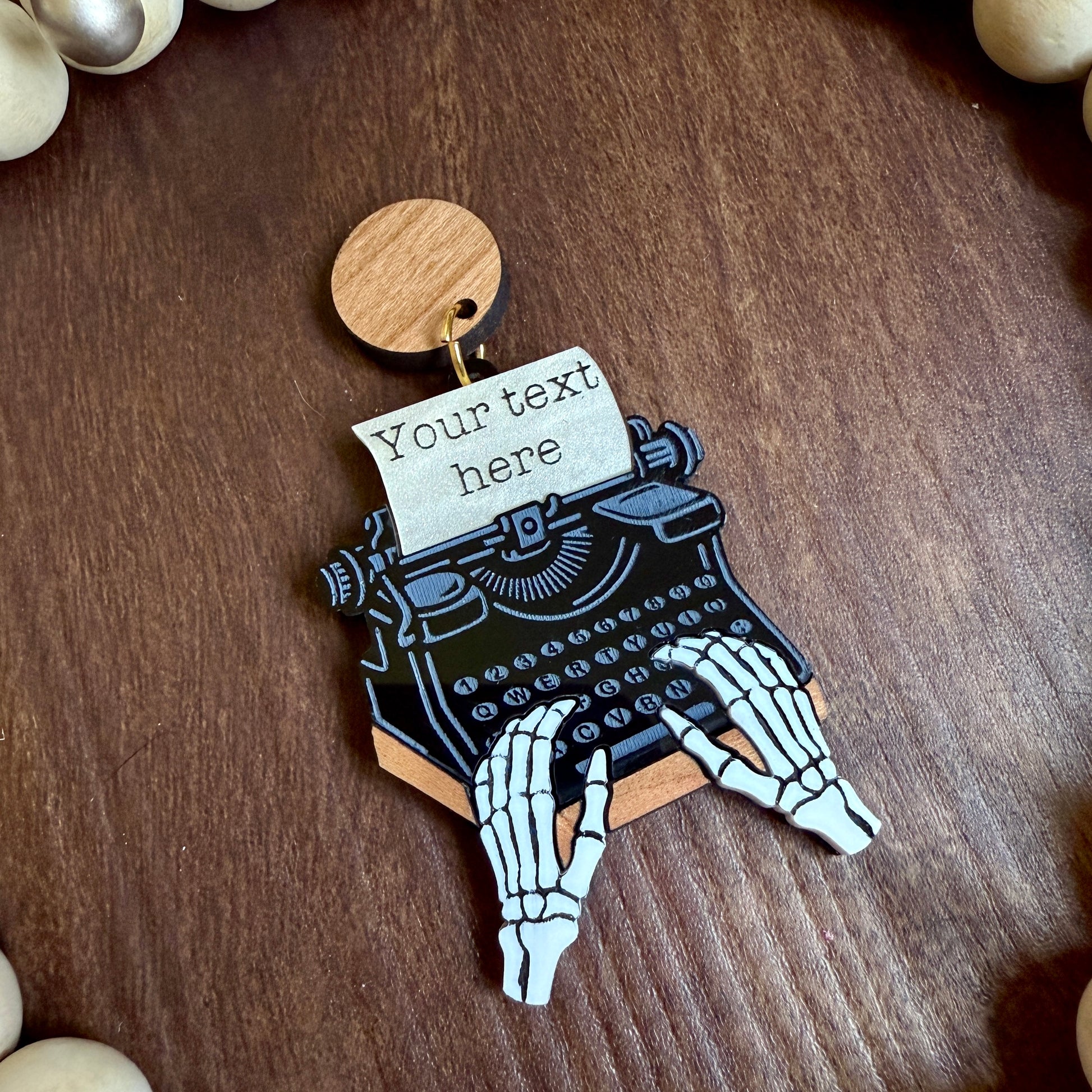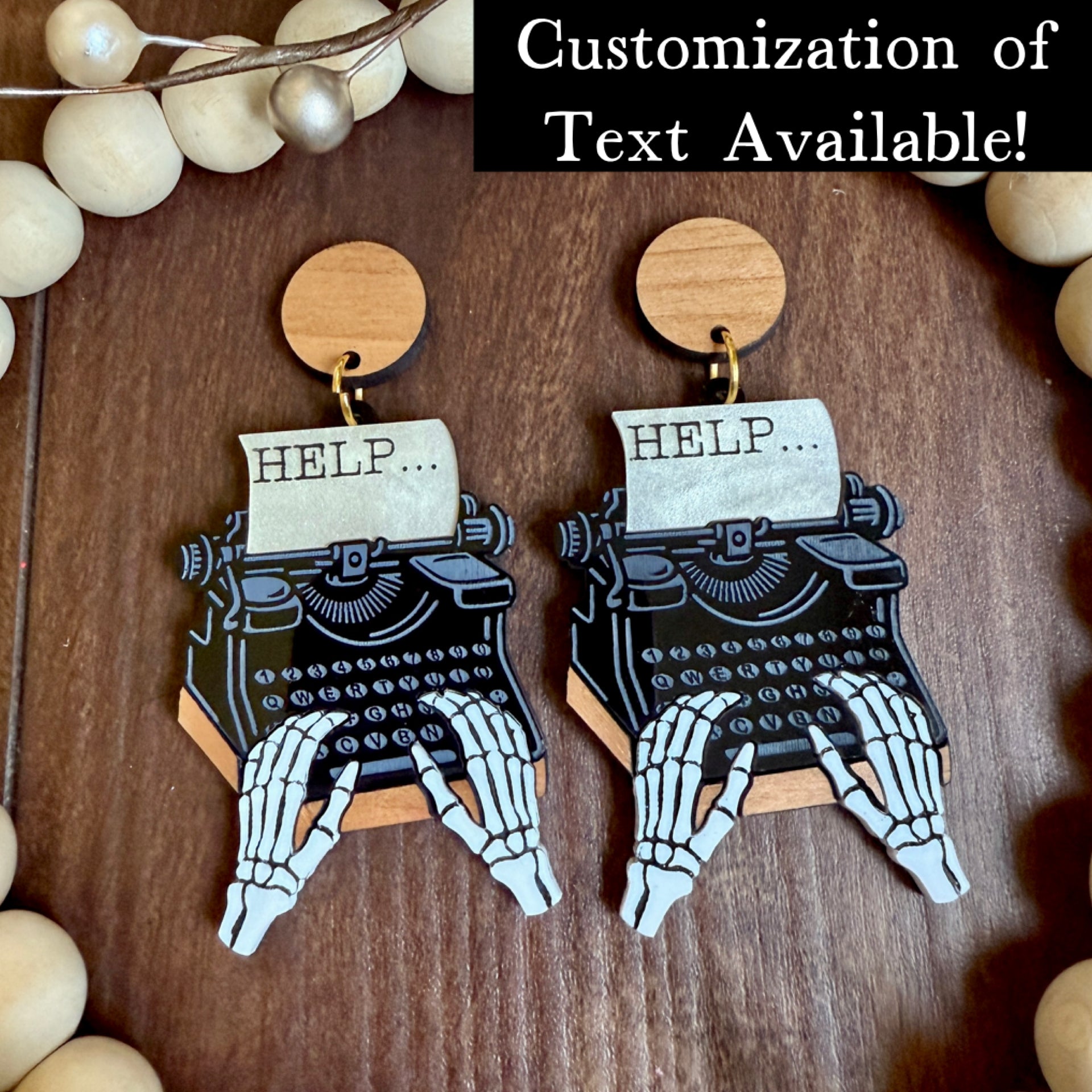 Vintage typewriter with skeleton hands and your choice of saying! These light to medium weight Halloween earrings measure 2.1” long, not including the circle posts.