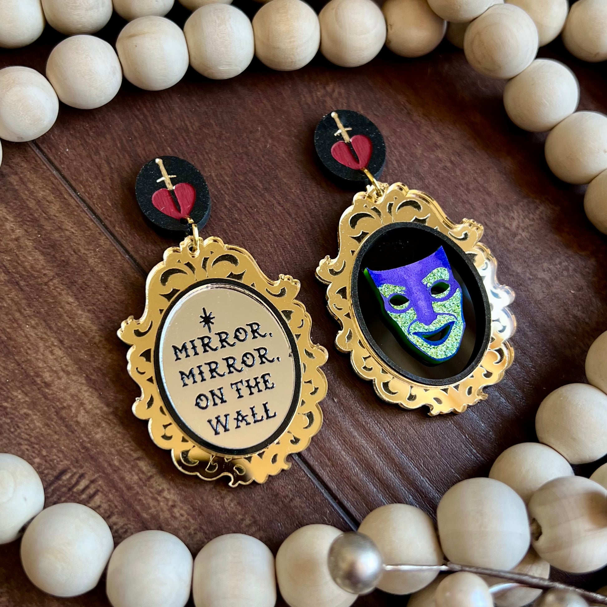 How incredible are these showstoppers?! Mismatched mirror dangles cut from gold and silver mirror acrylic! Perfect for any Snow White or Disney fan!