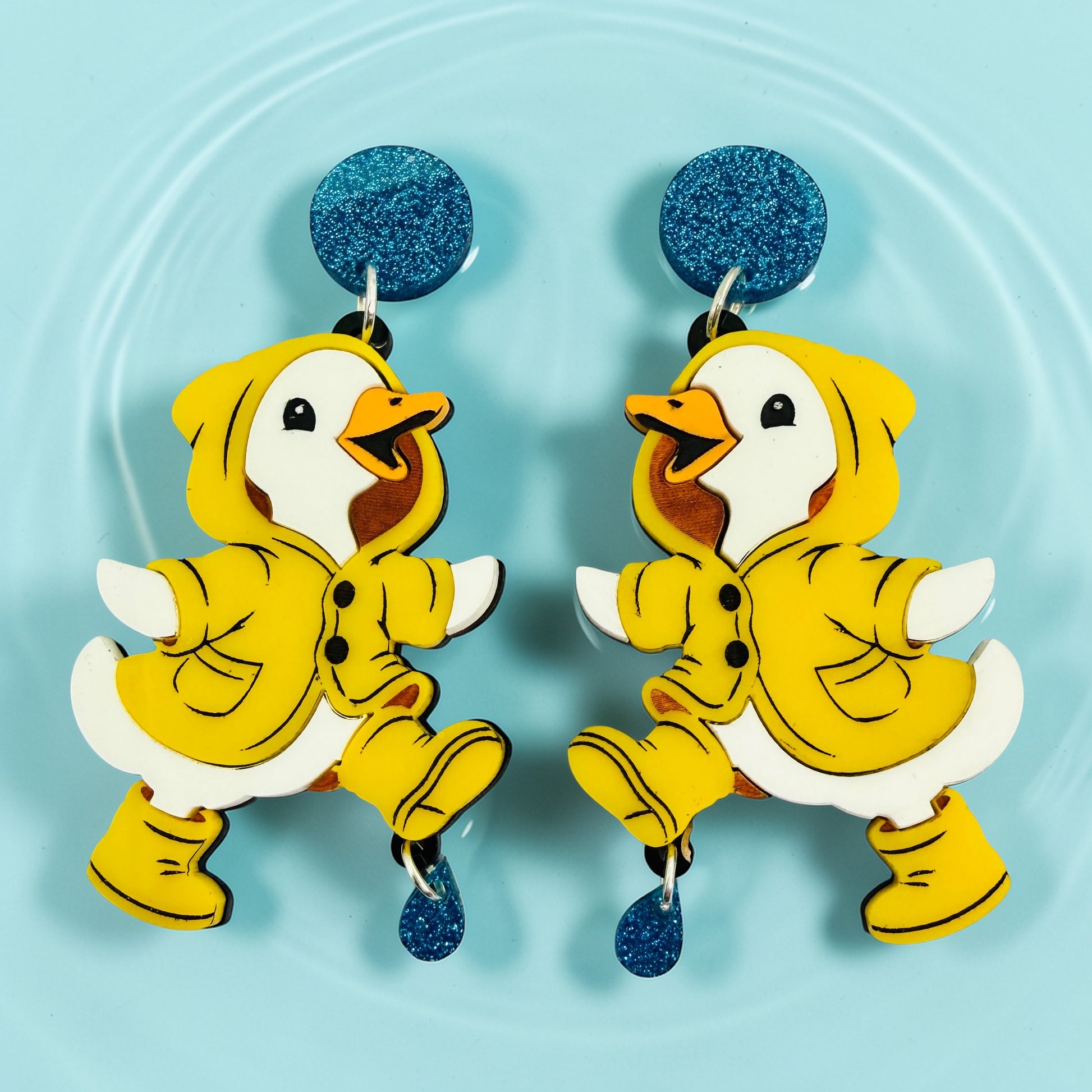 How incredible are these showstoppers?! 🀩 A goose wearing a raincoat splashing in the rain! Cut from gloss acrylics and accented with blue glitter acrylic.