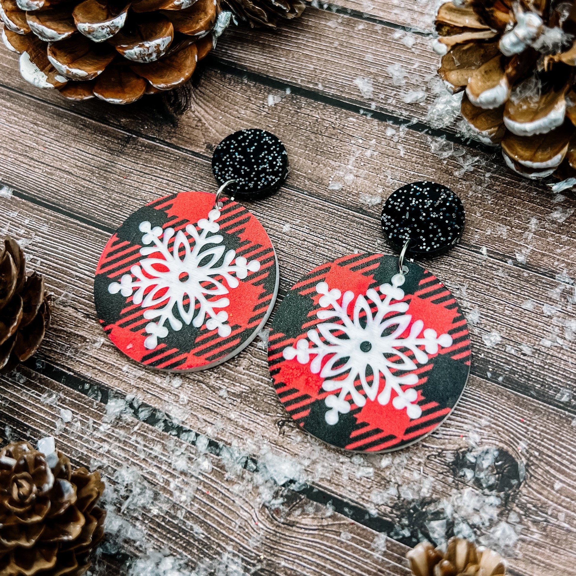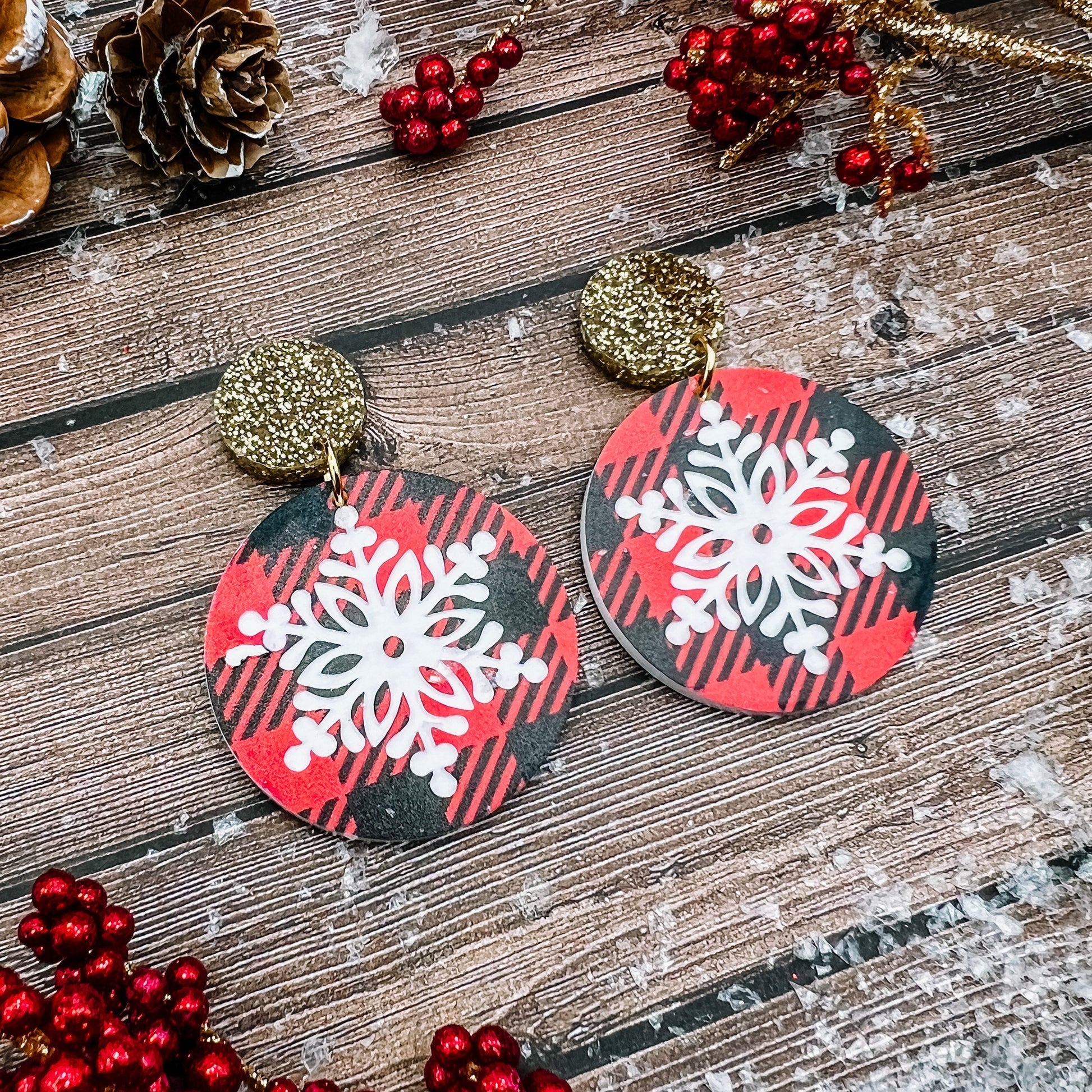 Laser engraved snowflakes on a buffalo plaid printed acrylic circle, made from a stunning glittery snowflake acrylic. The circle post is cut from your choice of black or gold glitter acrylic. These earrings are gorgeous and sure to be show stoppers! Perfect all winter long!These lightweight earrings measured 1.5 inches in diameter, not counting the circle studs.