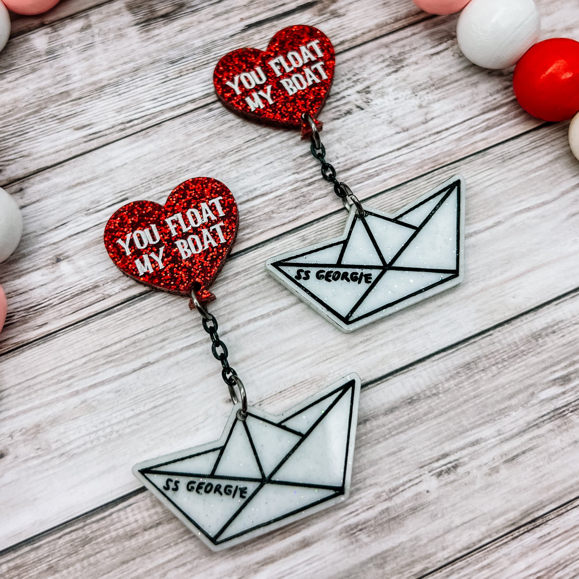 Perfect Valentines Day earrings for horror movie lovers! Heart shaped balloons holding a paper boat, inspired by It
