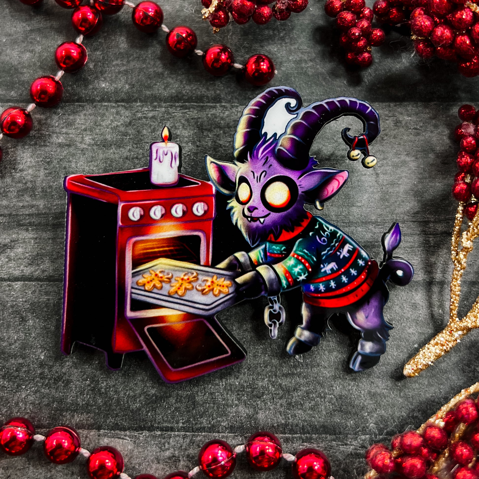 Krampus baking Krampus cookies! Sublimated on Unisub! Measures 2.25” wide.