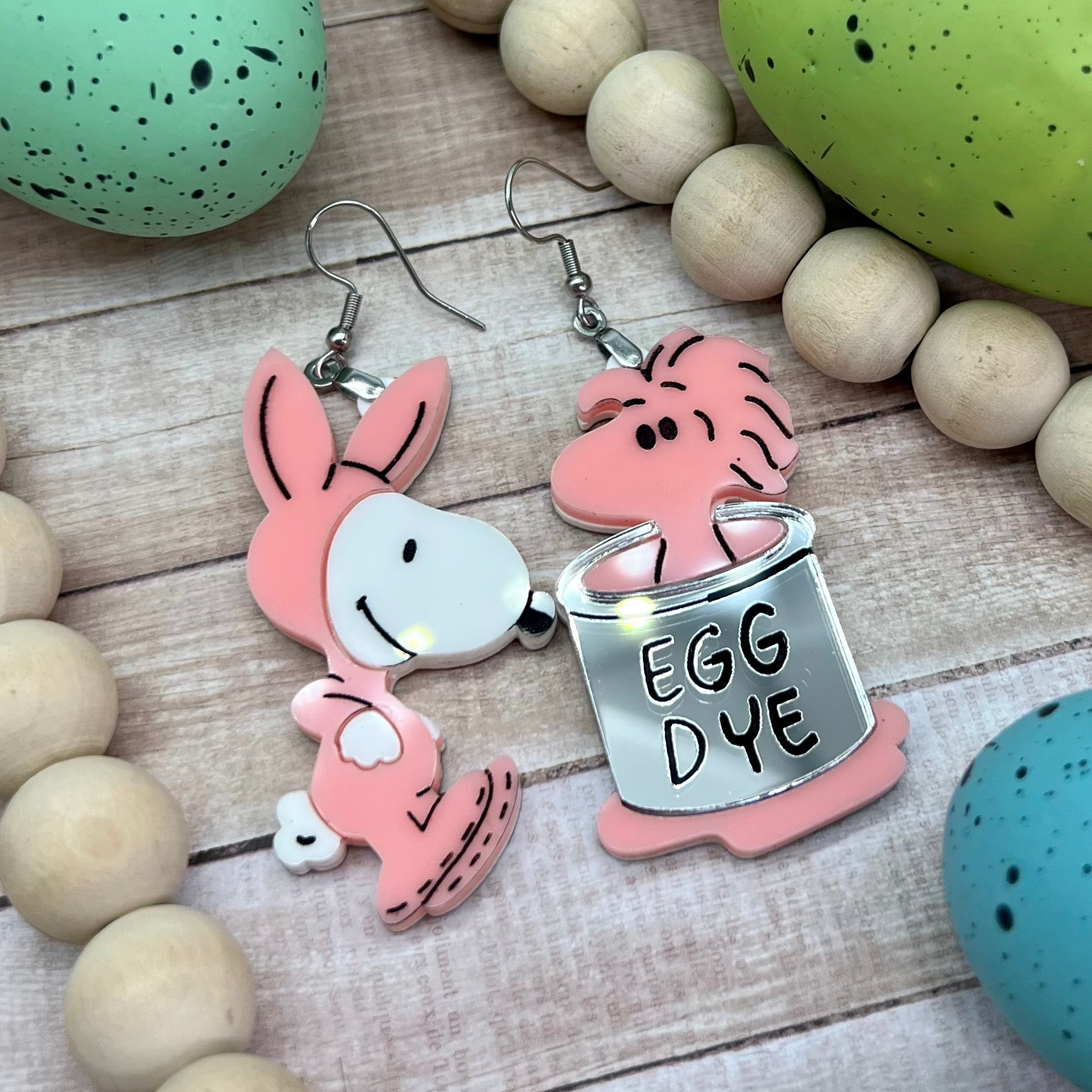 Nostalgic cartoon pups and bird friend in an Easter theme! Cut from pastel pink and silver mirror acrylics!