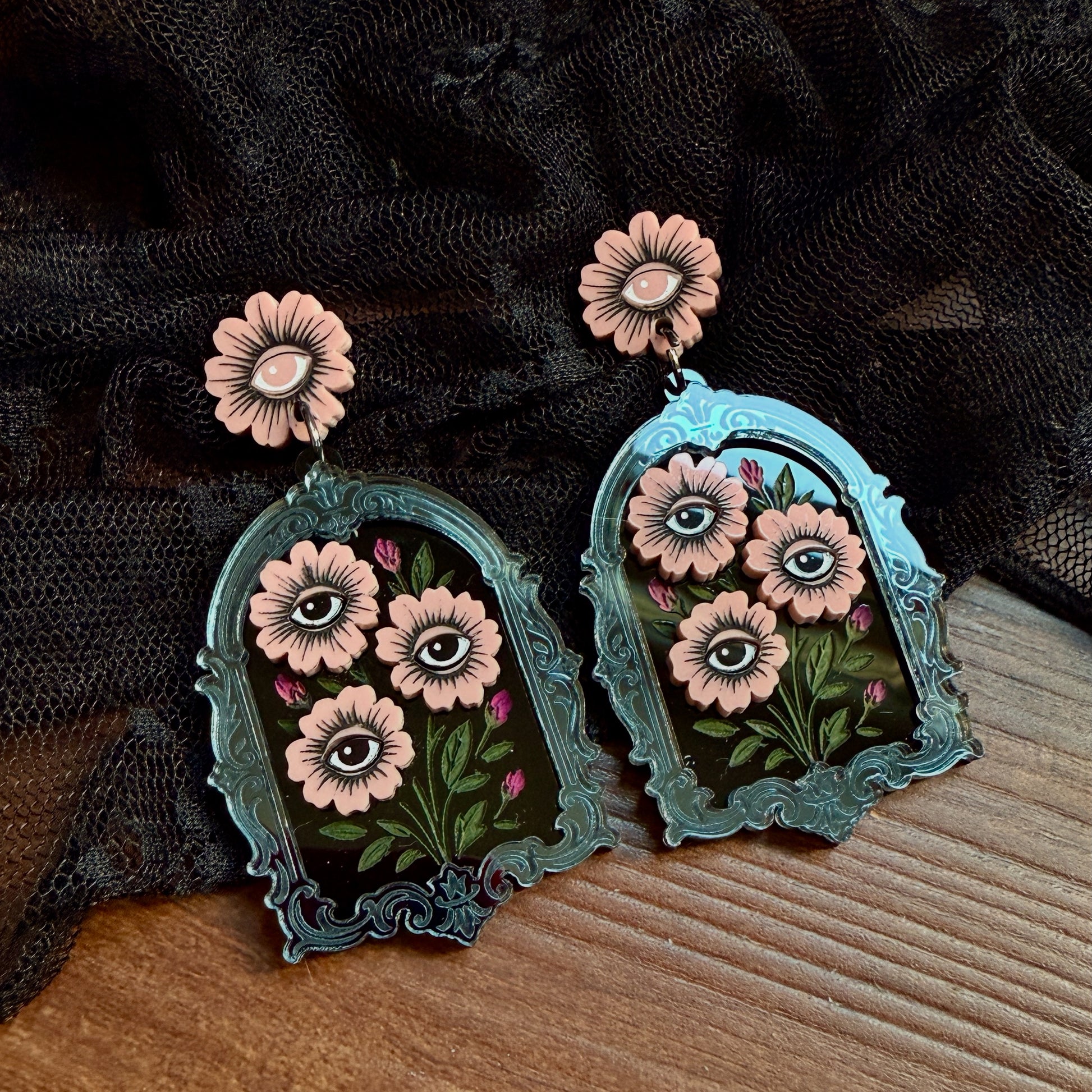 Lightweight framed eye flowers cut from a mauve acrylic and gun metal mirror for the frame. Paired with a mauve eye flower post!