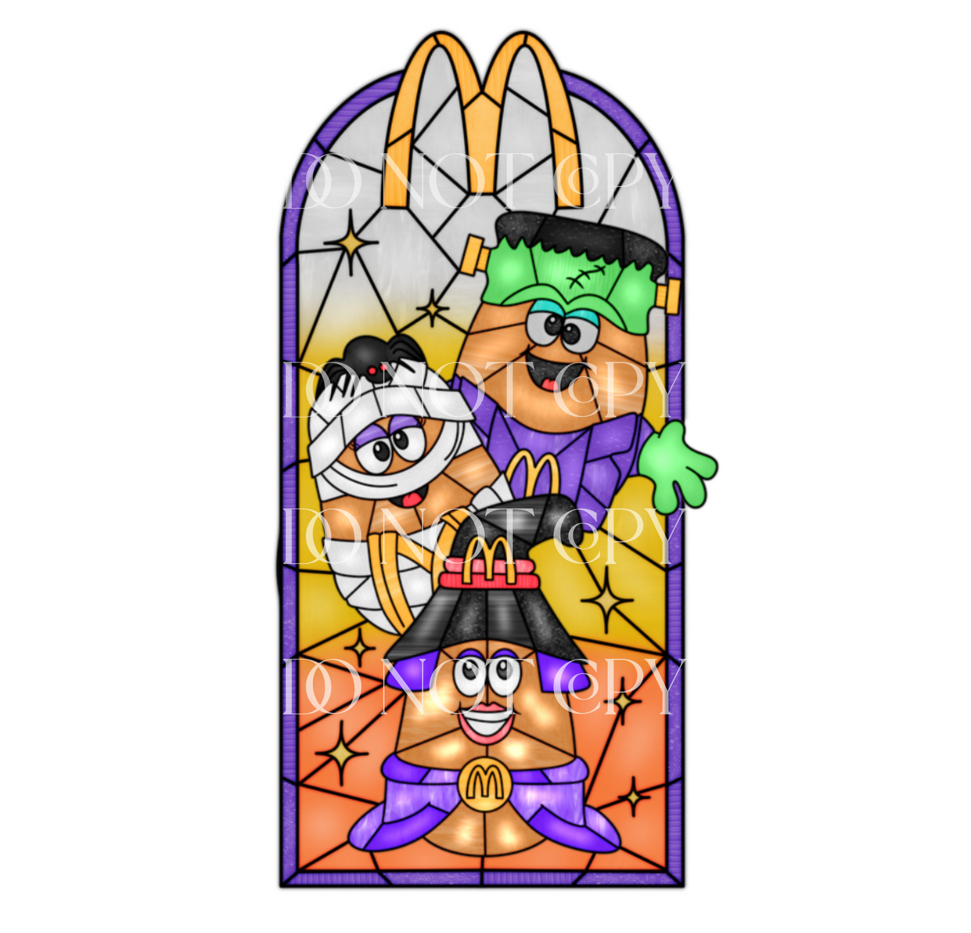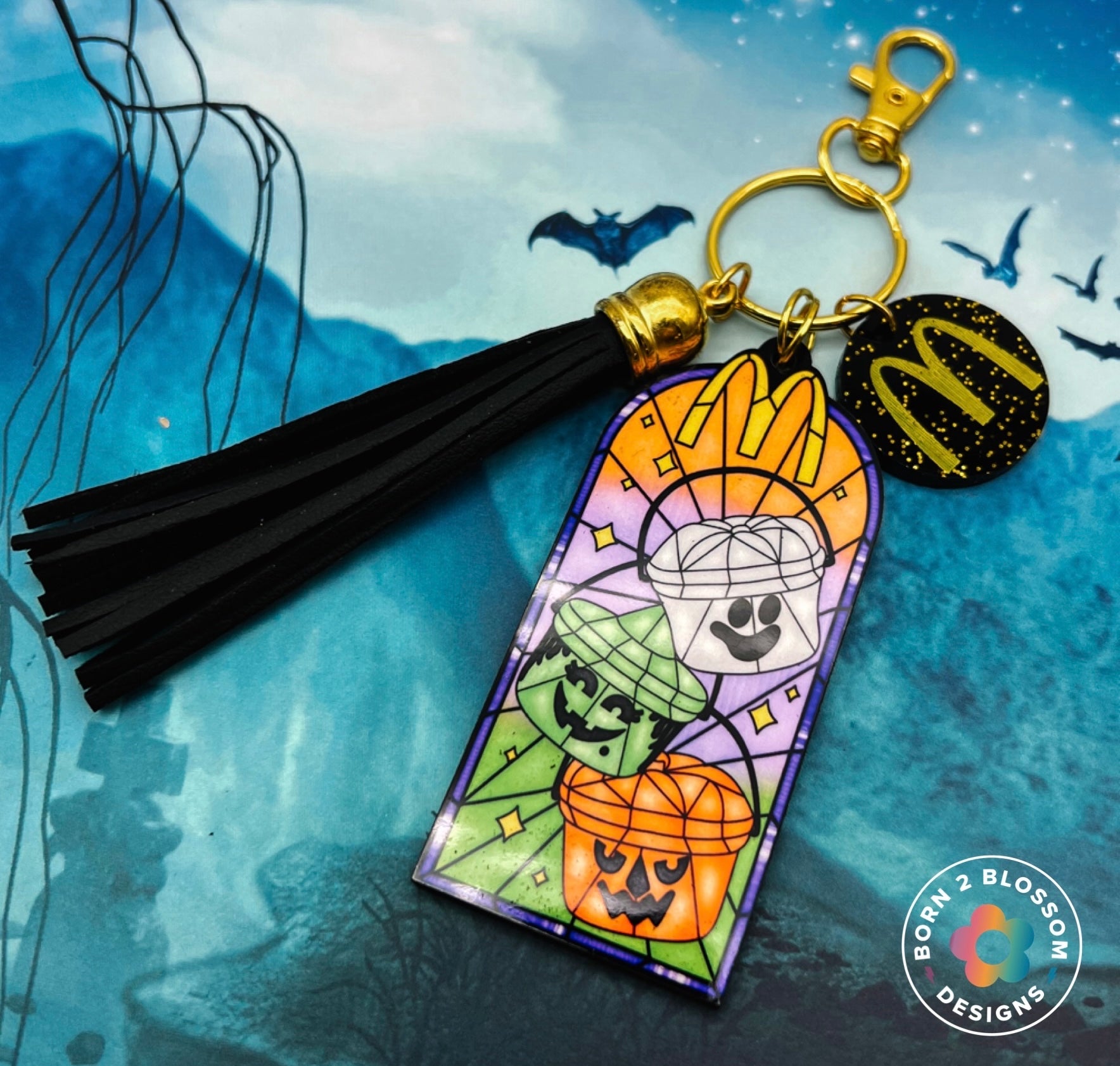 Total 90s nostalgia with this McDonalds Halloween design on a keychain! The keychain features the McDonald’s design on 1/8” Unisub, a logo charm cut from black and gold glitter acrylic, and a black tassel.