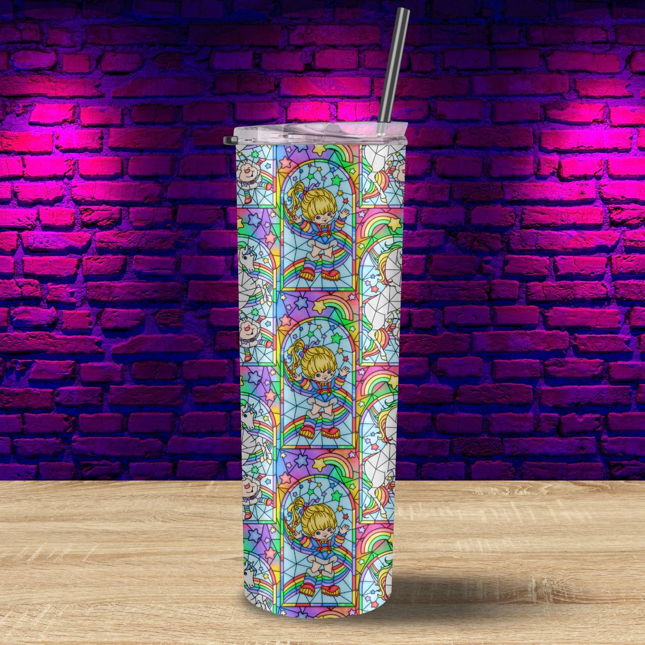 This is a sublimated glossy 20oz tumbler featuring Rainbow Brite and her horse Starlite!