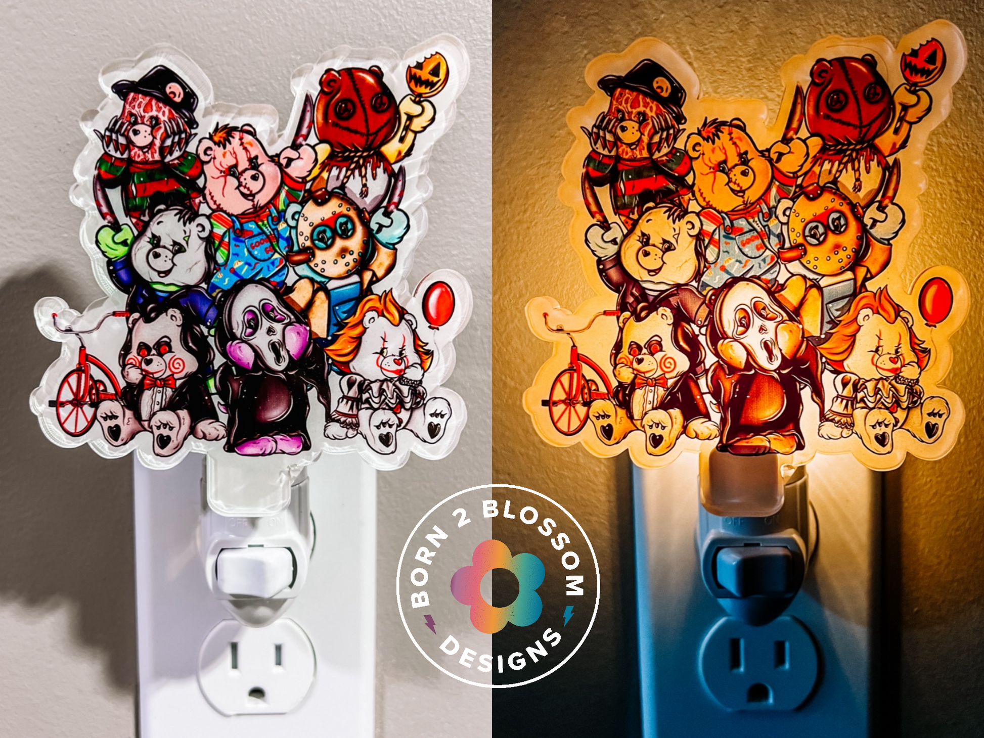 Your favorite horror characters as Care Bears sublimated on a 4” wide piece of acrylic. It comes with a nightlight plug in base and incandescent bulb.