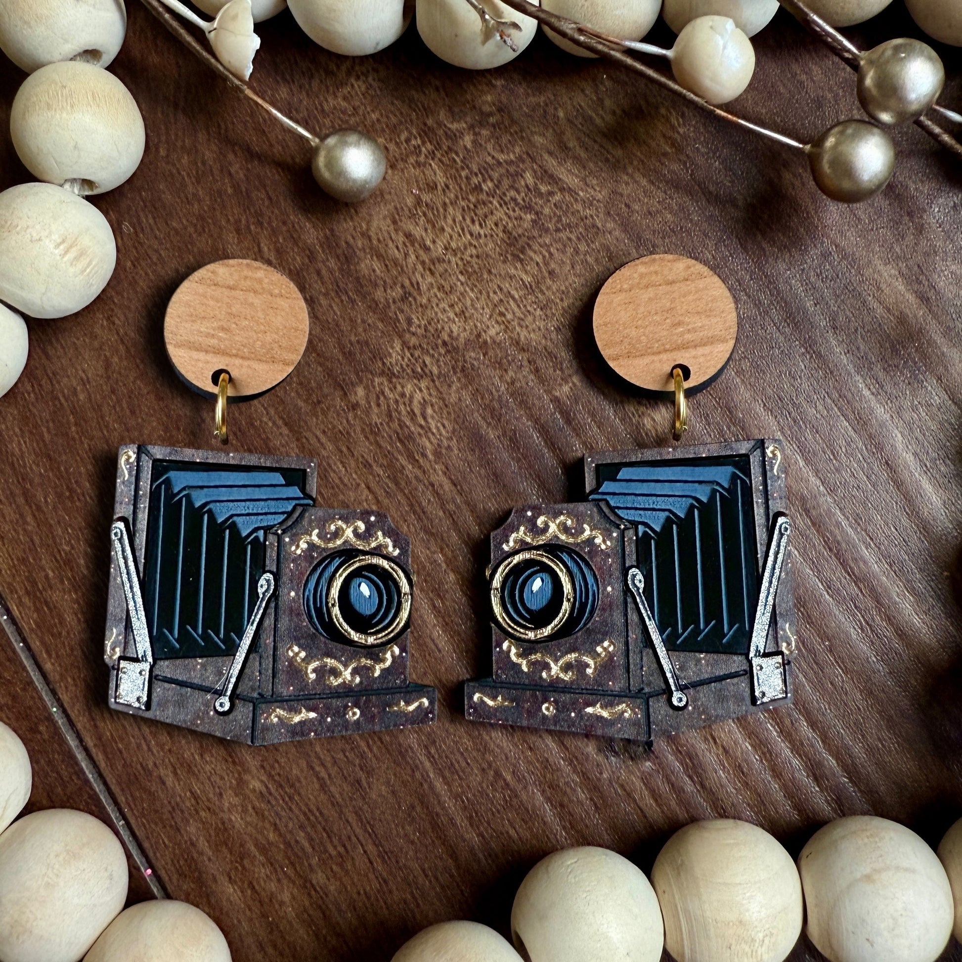 Vintage cameras cut from various glossy and sparkly acrylics! These light to medium weight Halloween earrings measure 1.75” long, not including the circle posts. The brooch measures 2.6” long with the tripod.