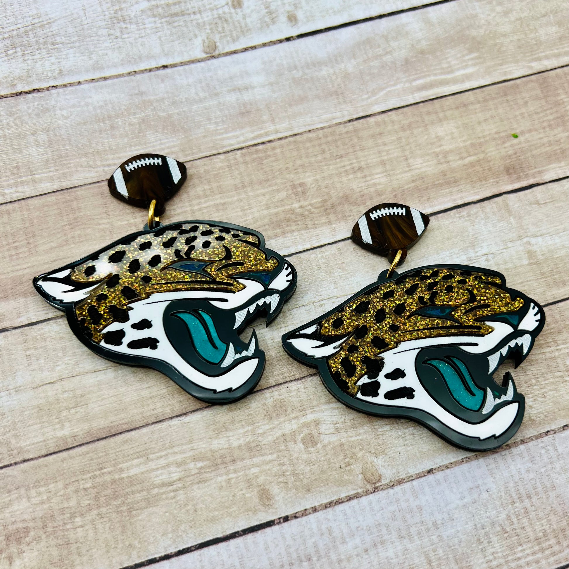 Show your Jacksonville team pride with these showstopper acrylic earrings! These beauties are made from various acrylics including gold glitter acrylic! Perfect gift for any fan!!