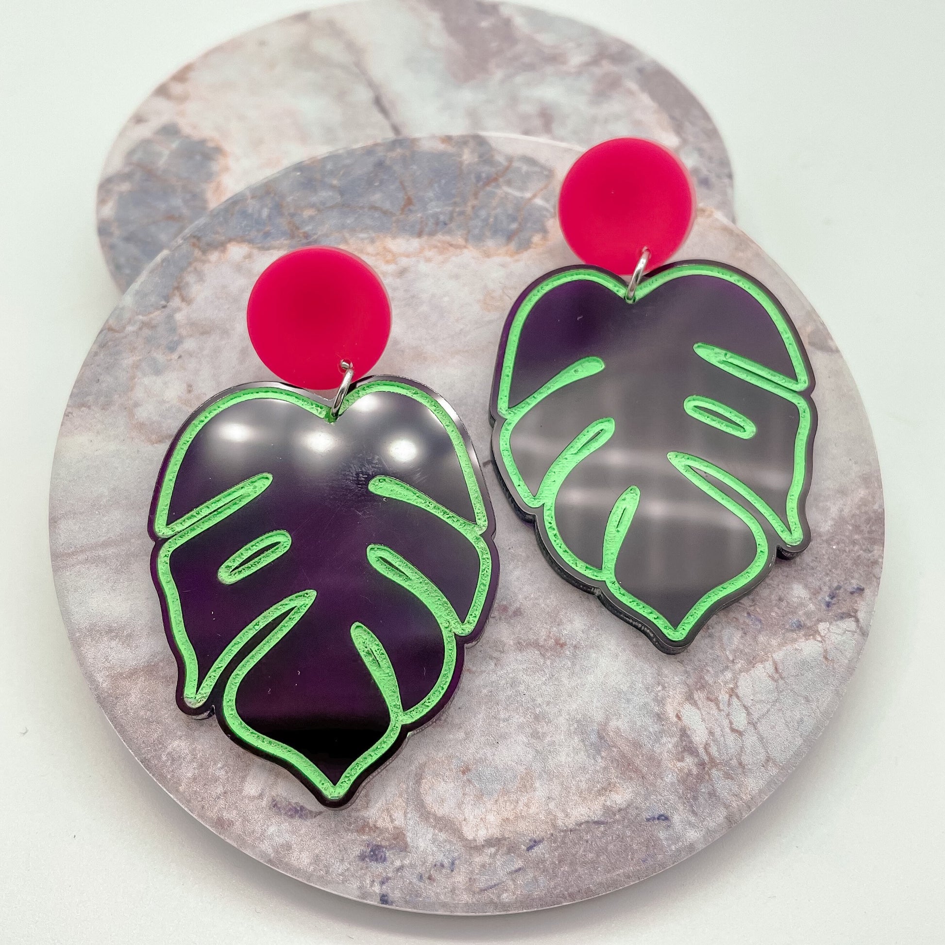 Laser cut Monstera Leaf neon sign earrings! Made from fluorescent acrylic! Showstoppers for sure!These lightweight earrings measured 2 inches inches long, not counting the circle posts.
