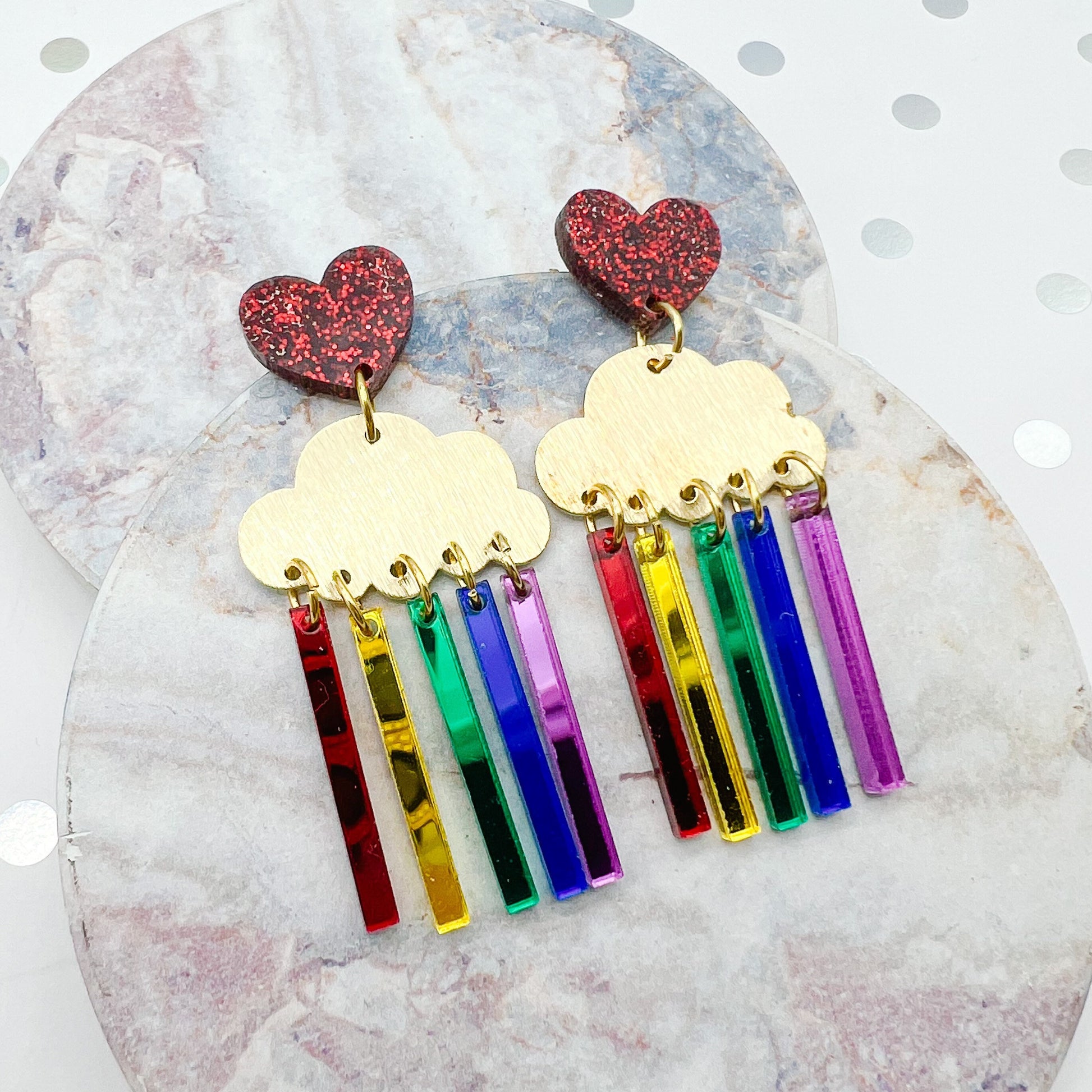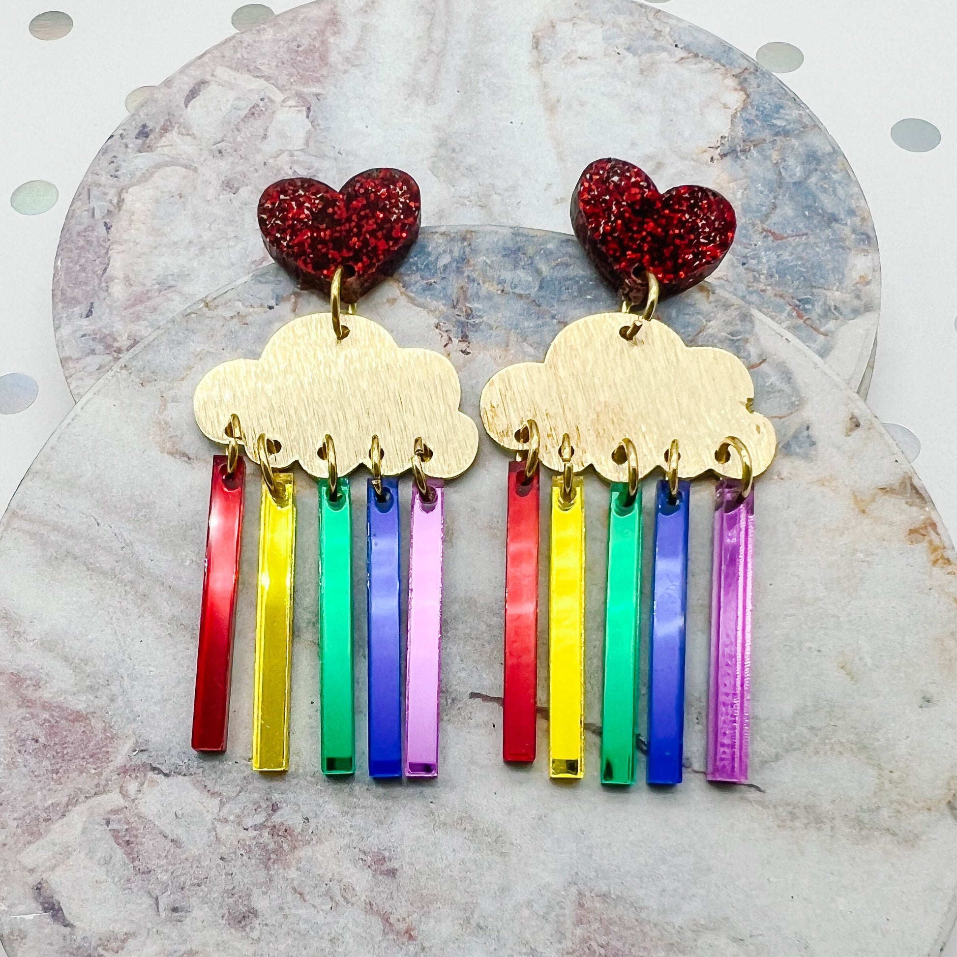 Laser cut acrylic Pride earrings. Brass clouds with mirror acrylic ‘rain’ and paired with a red glitter heart stud. Beautiful statement earrings!