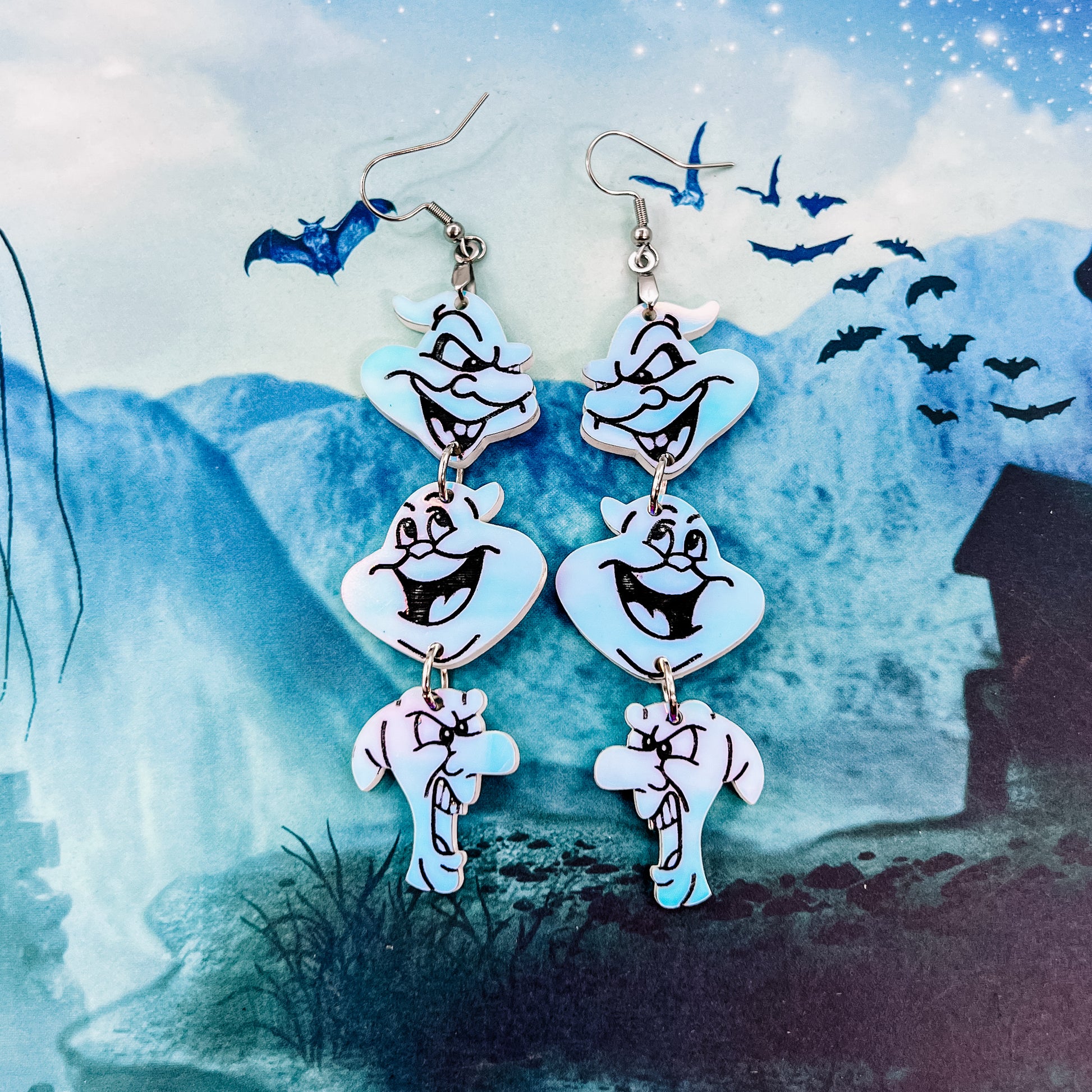Casper’s Uncles earrings cut from a color shifting iridescent acrylic!