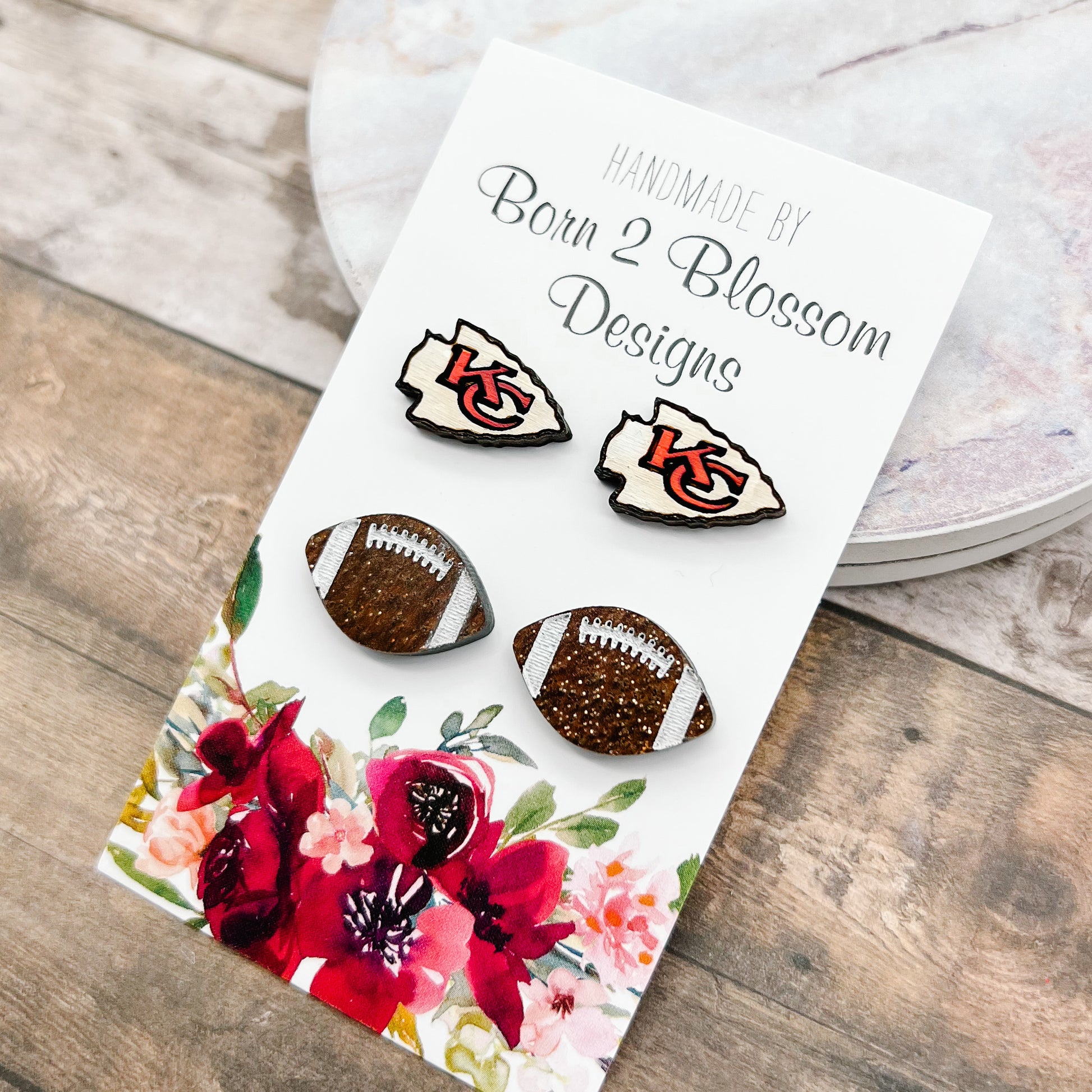 Kansas City Chiefs logos cut from wood and hand paint need. Paired with a football stud cut from a marbled brown acrylic. Perfect for KC Chiefs and Missouri sports fans!!