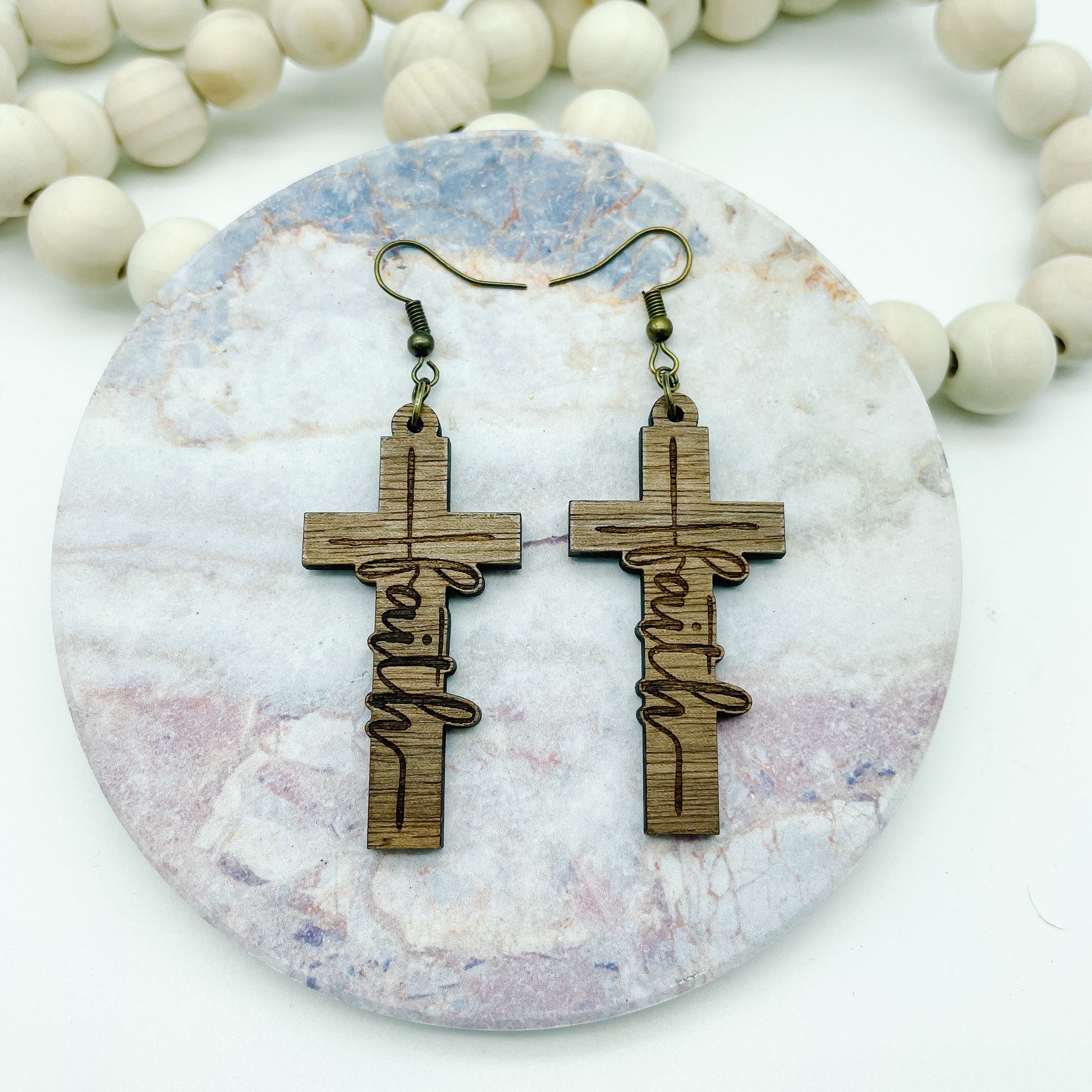Laser cut crosses engraved with ‘Faith’, made from walnut wood. These are perfect year round, but especially for Easter!These lightweight earrings measured 1.75 inches long, not counting the hooks.