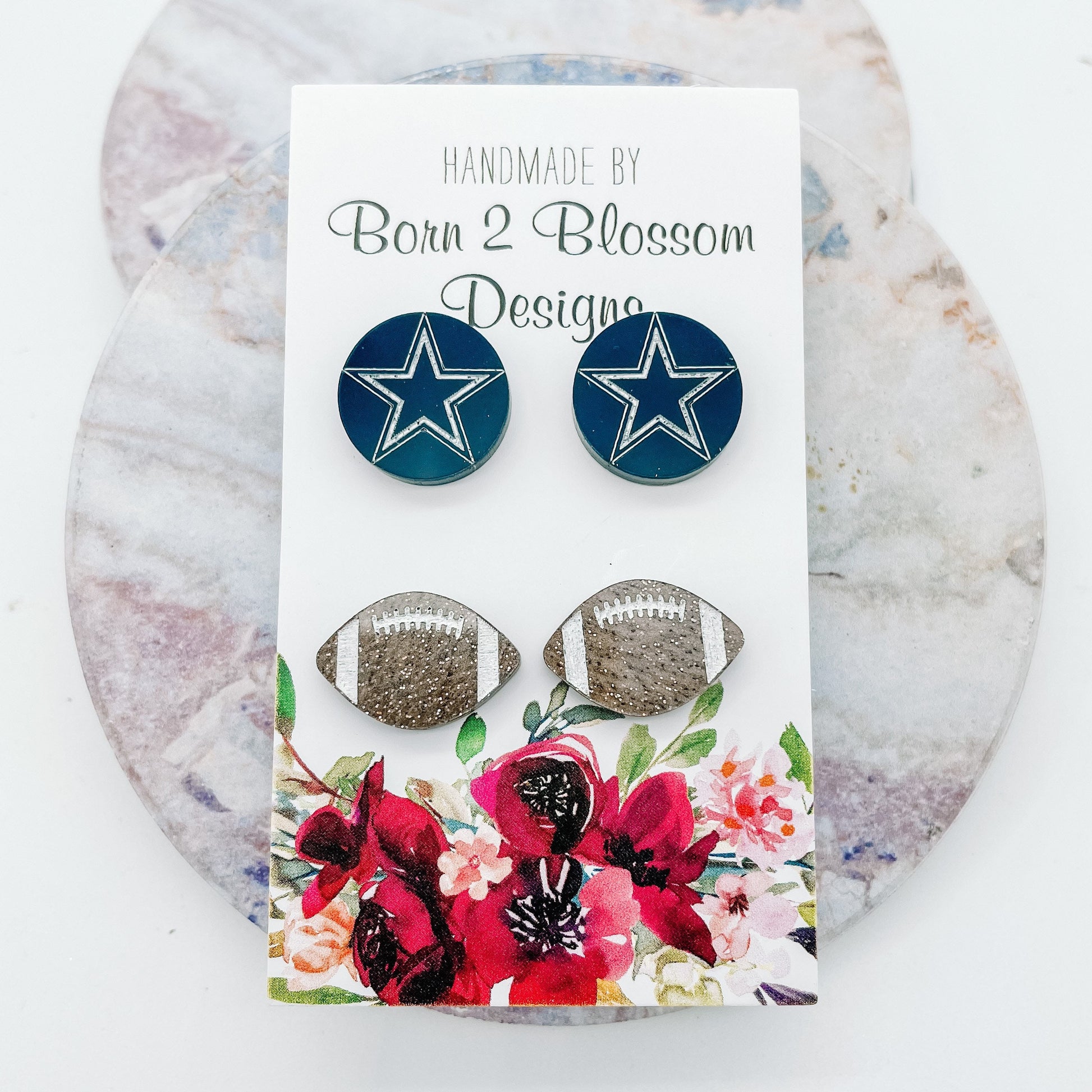 Show your Dallas team pride with TWO pairs of stud earrings! The Cowboys logo studs are made from a navy acrylic and the football studs are made from a brown marble acrylic! Go Cowboys!