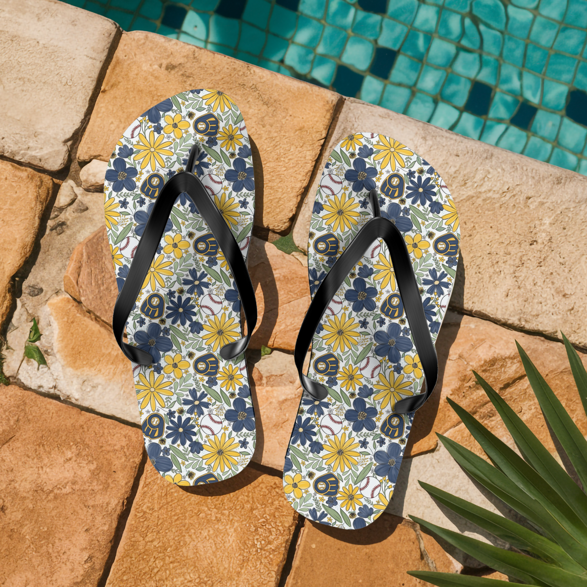 Sublimated unisex flip flops with a floral Milwaukee Brewers design!