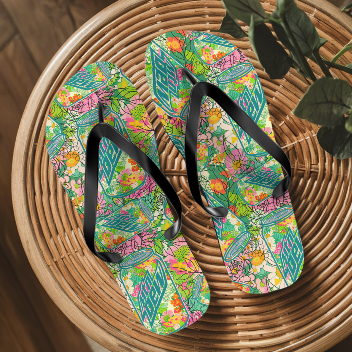 Flip flops have a polyester fabric top with a 1/2 inch black rubber sole, and a secure black strap.