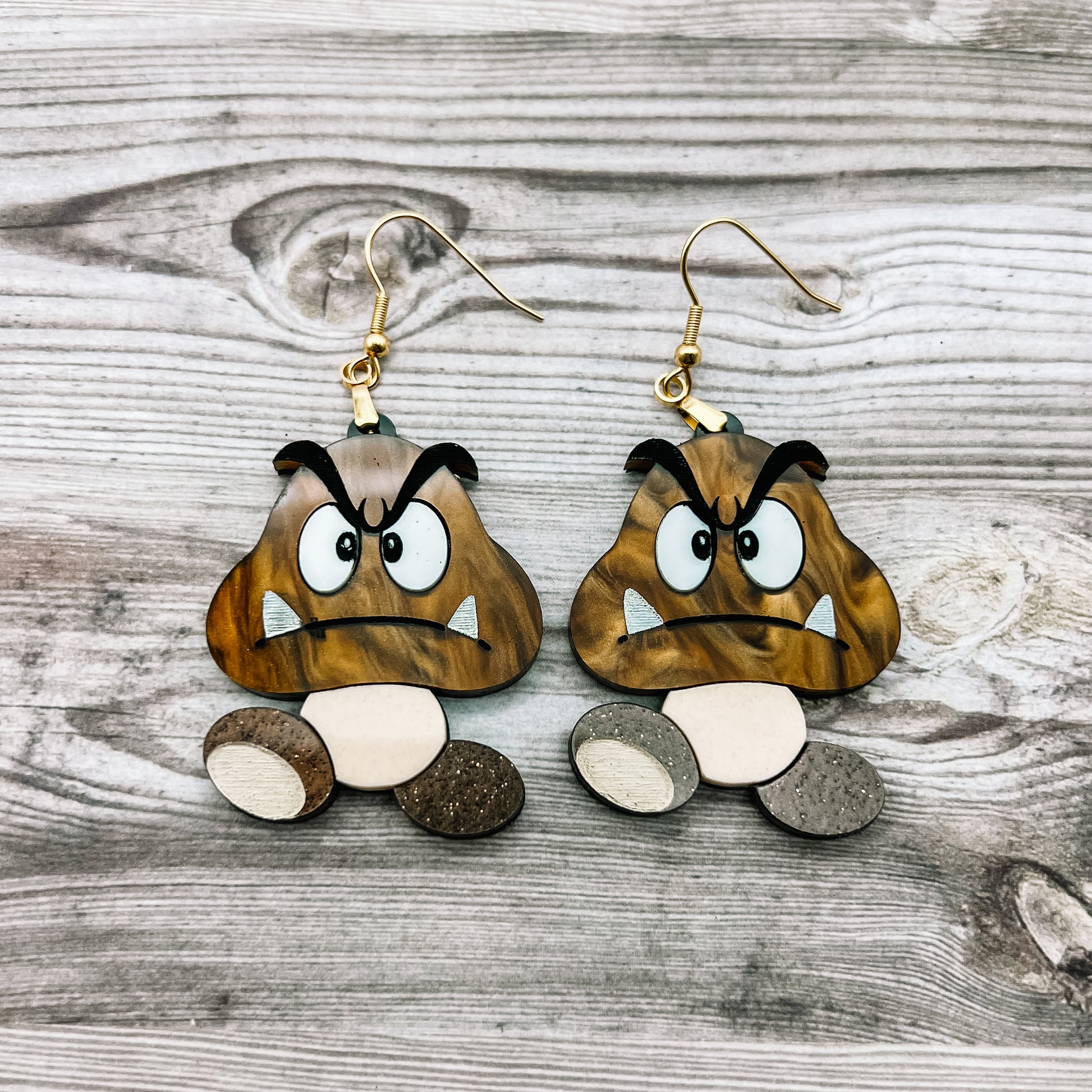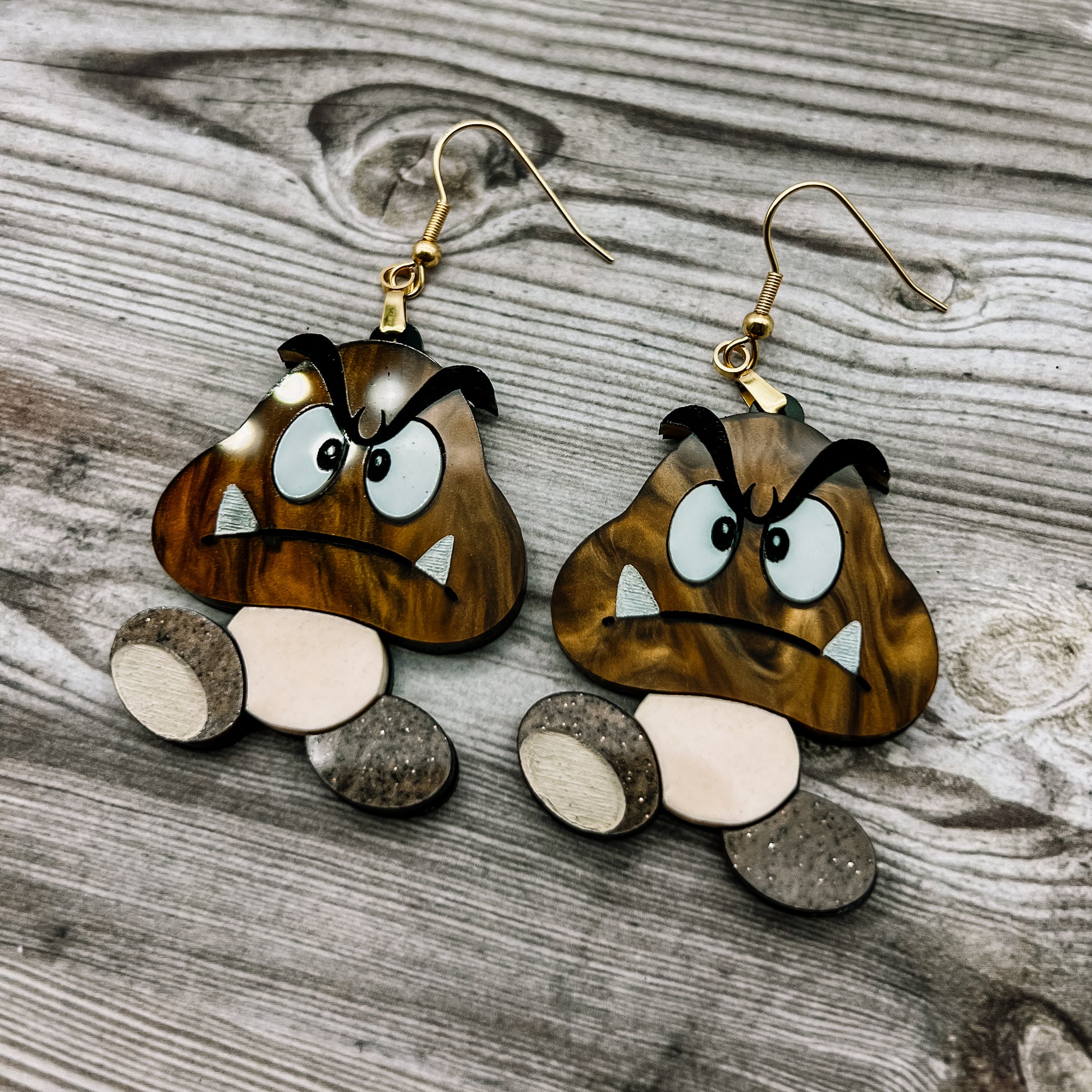 Goomba dangles cut from a gorgeous brown marble acrylic! Perfect for any gamer!