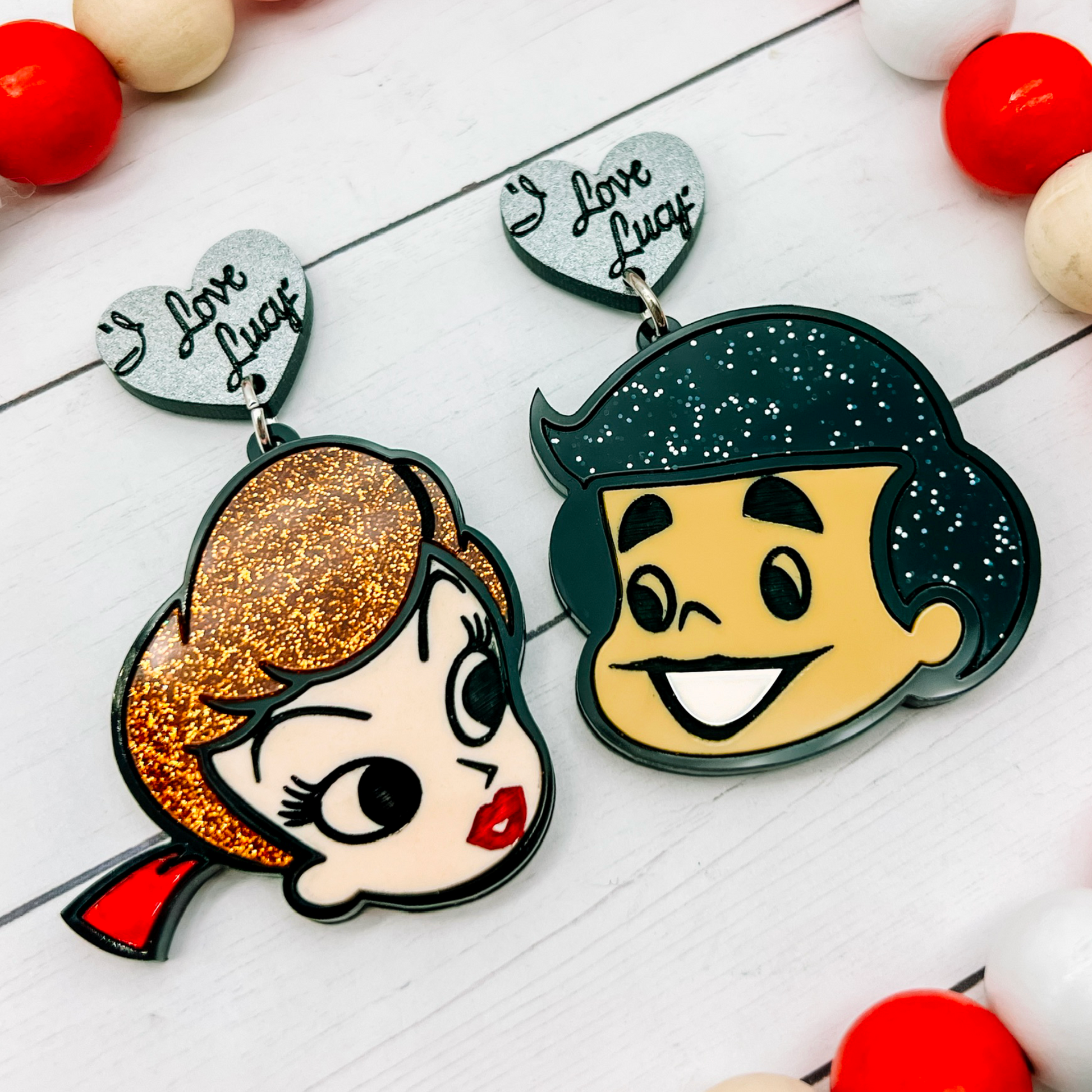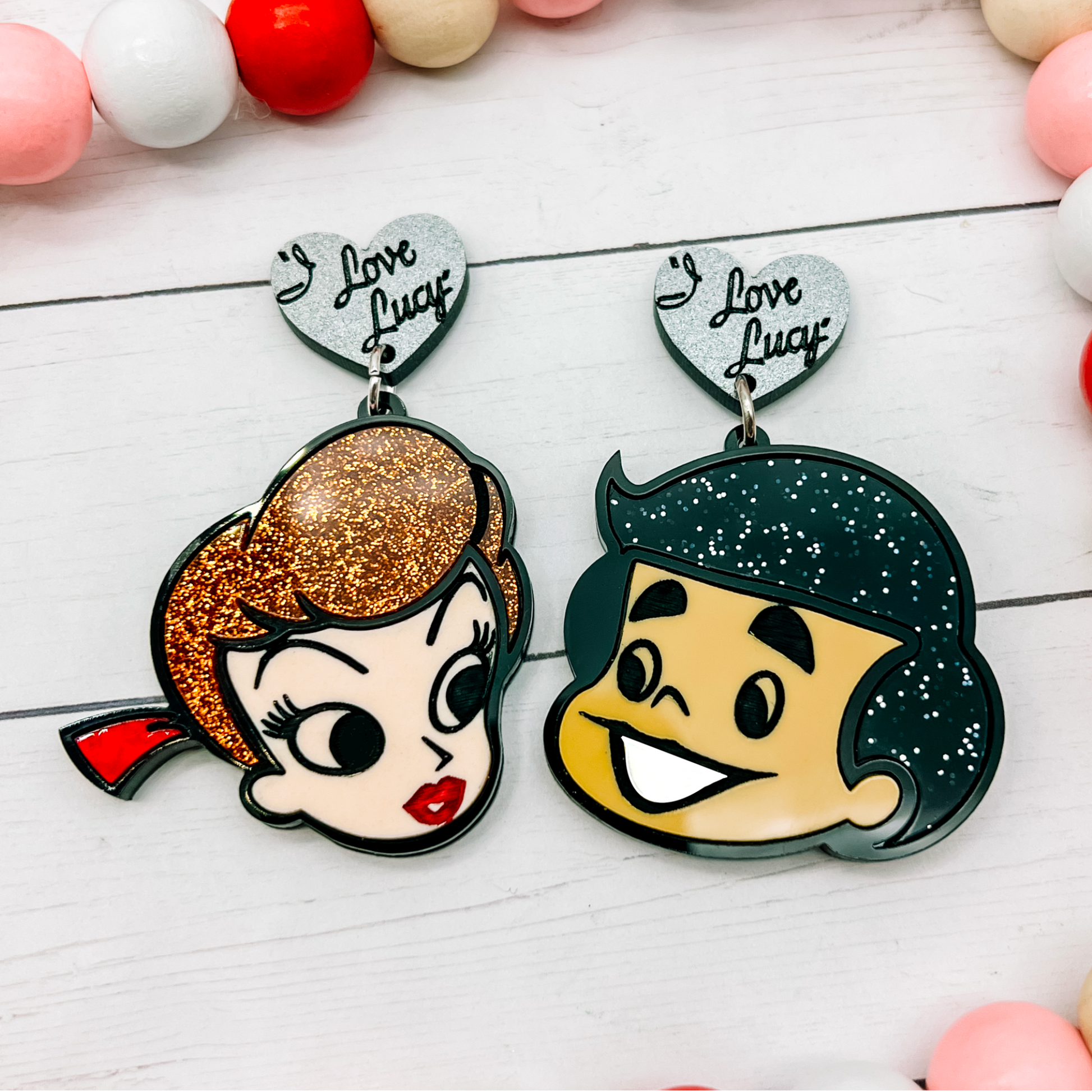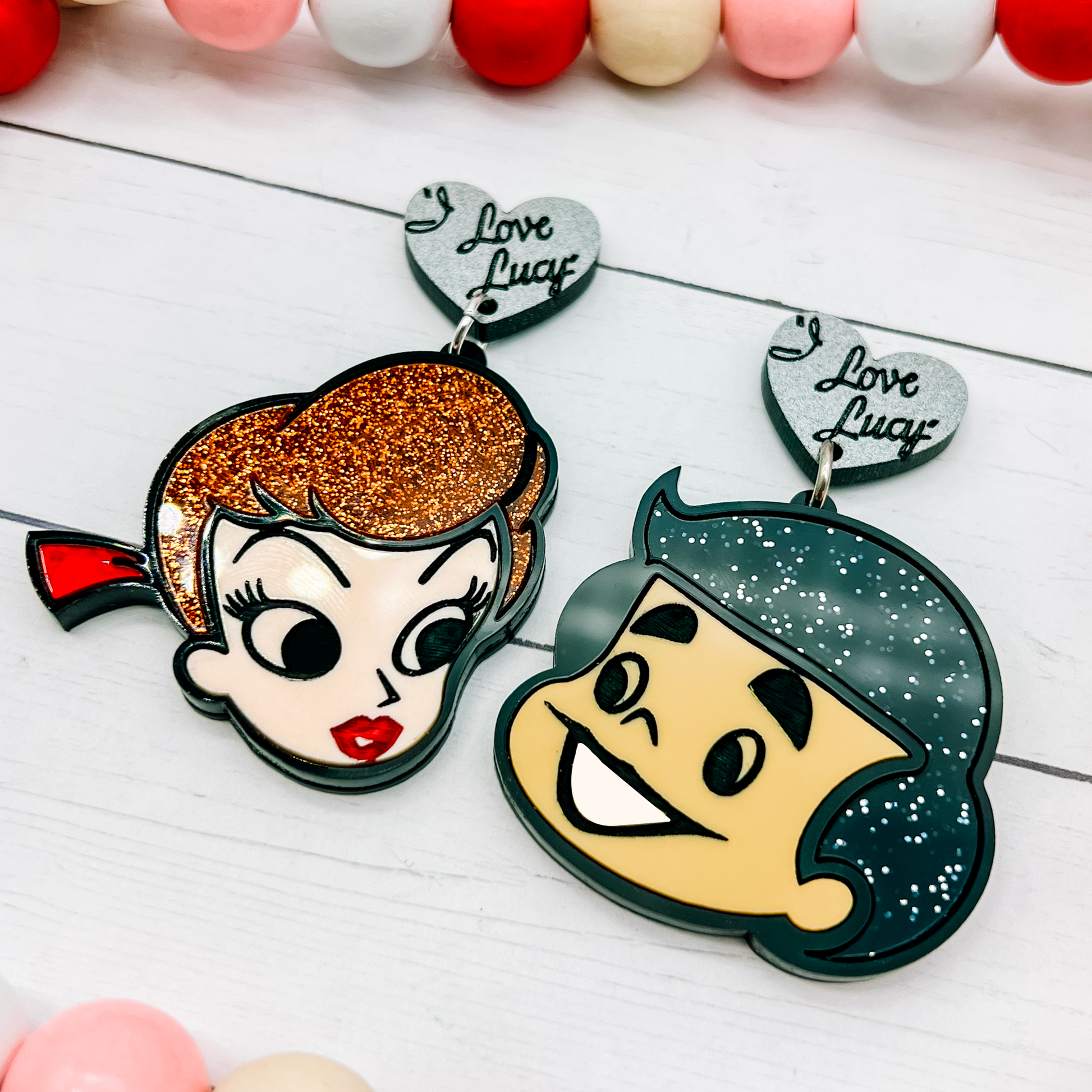 Note about backing options:  If you order with Hooks and or as a Brooch, earrings will not include I Love Lucy heart on top.  Also available in clip ons.  For the set of Brooches, the earrings will be converted using a pin instead of earring hardware.
