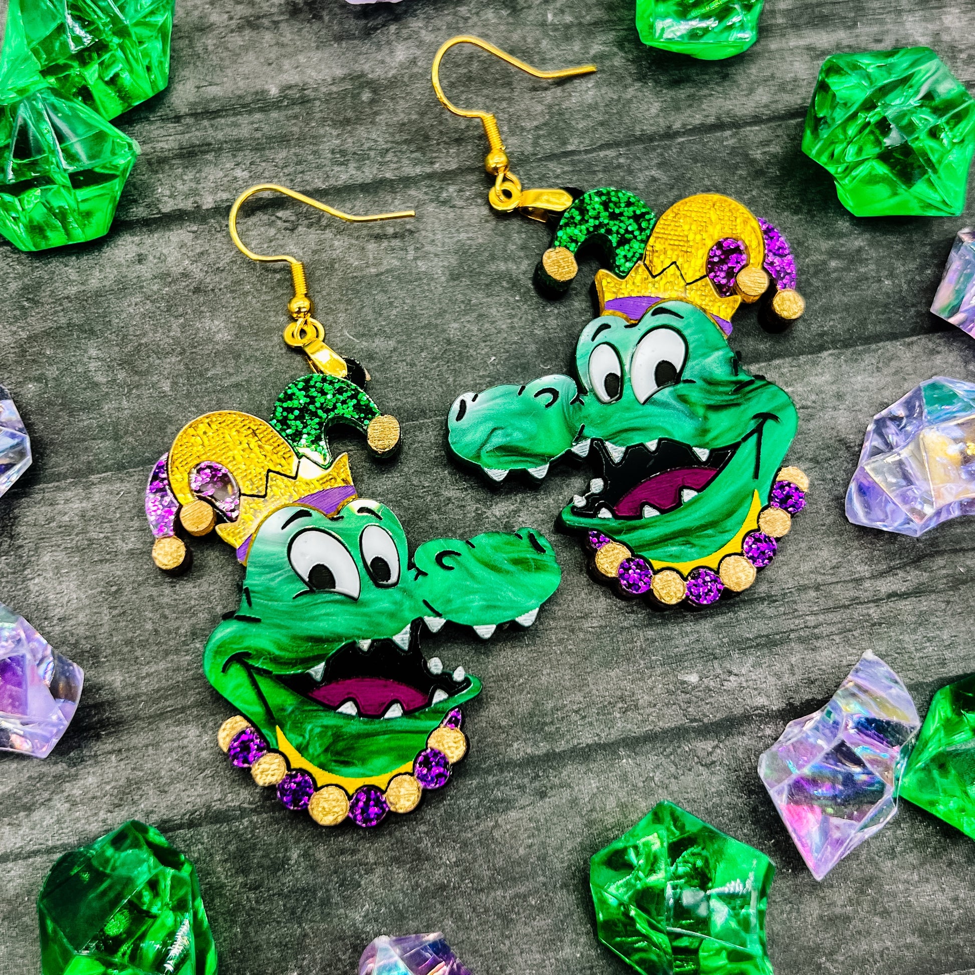 Mardi Gras themed alligator dangles cut from various glittery and marble acrylics! These earrings measure 2” long not including the hypoallergenic hooks.