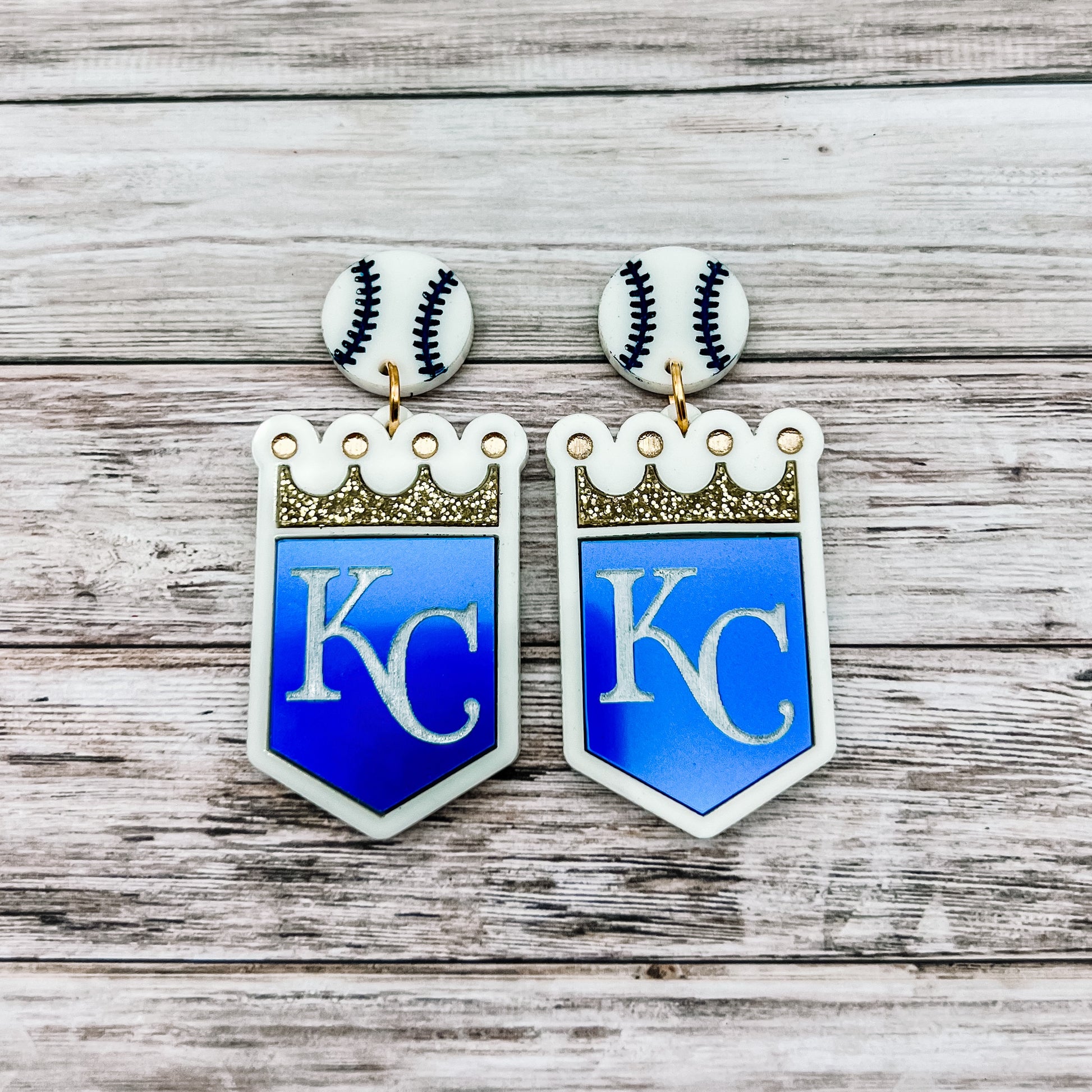 Royals logo earrings cut from gold glitter and metallic blue acrylics. Perfect for Royals fans!!