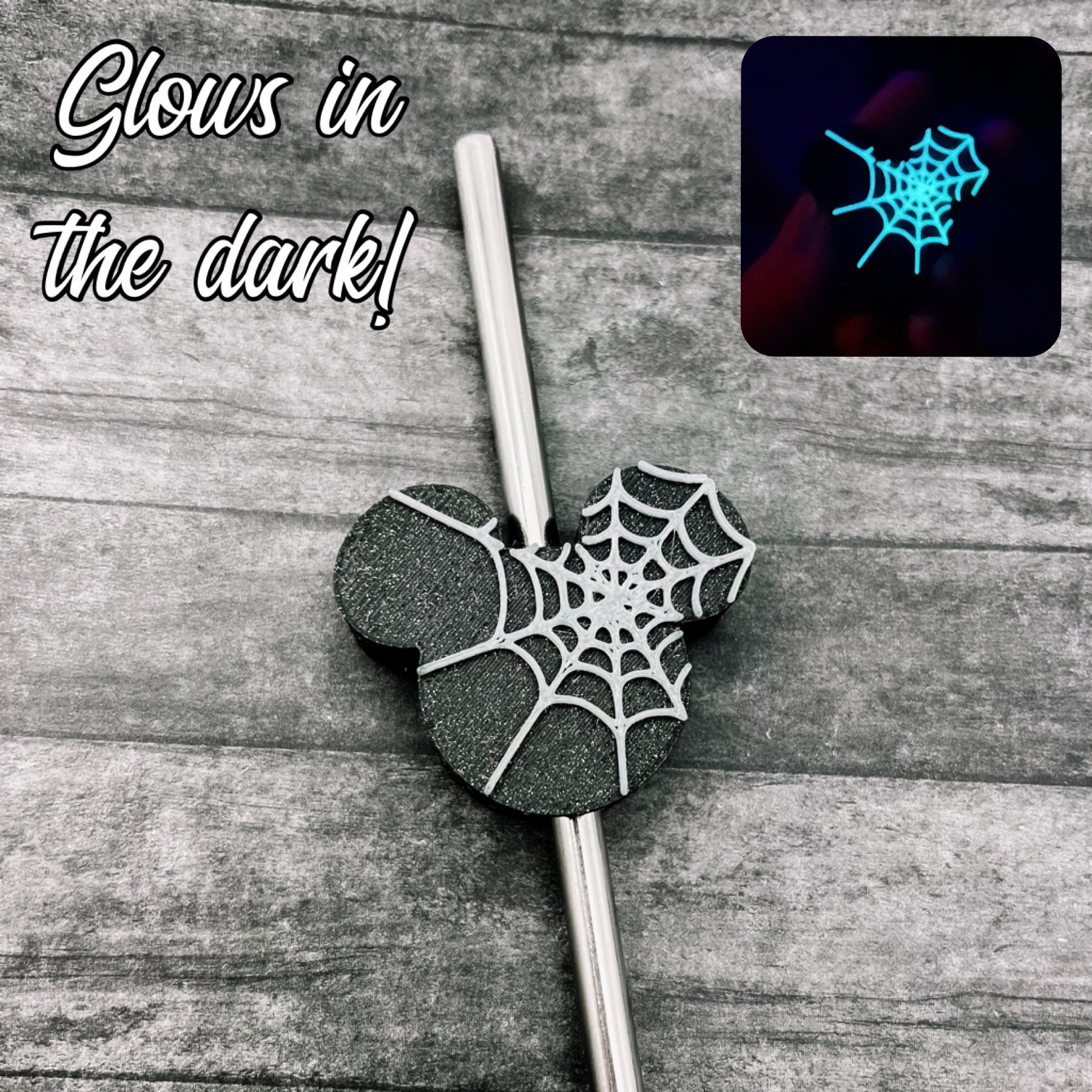 This 3D printed glow in the dark spiderweb Mickey straw topper. It measures 47mm wide, .6” thick. You have the choice of a standard straw opening, or a larger Stanley straw opening.