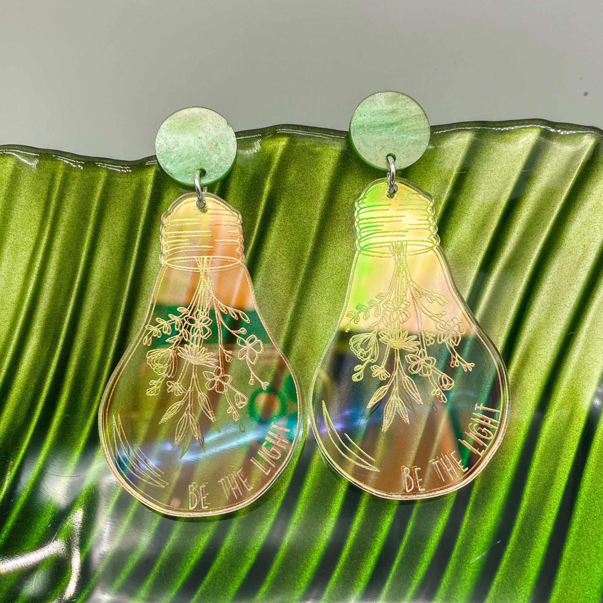 How incredible are these showstoppers?! 🤩 Be the Light Lightbulb acrylic earrings! These are made from rainbow acrylic which takes on the most awesome colors depending on the angle! Photos do not do these justice!These ultra lightweight earrings measured 2.25 inches long, not counting the circles.