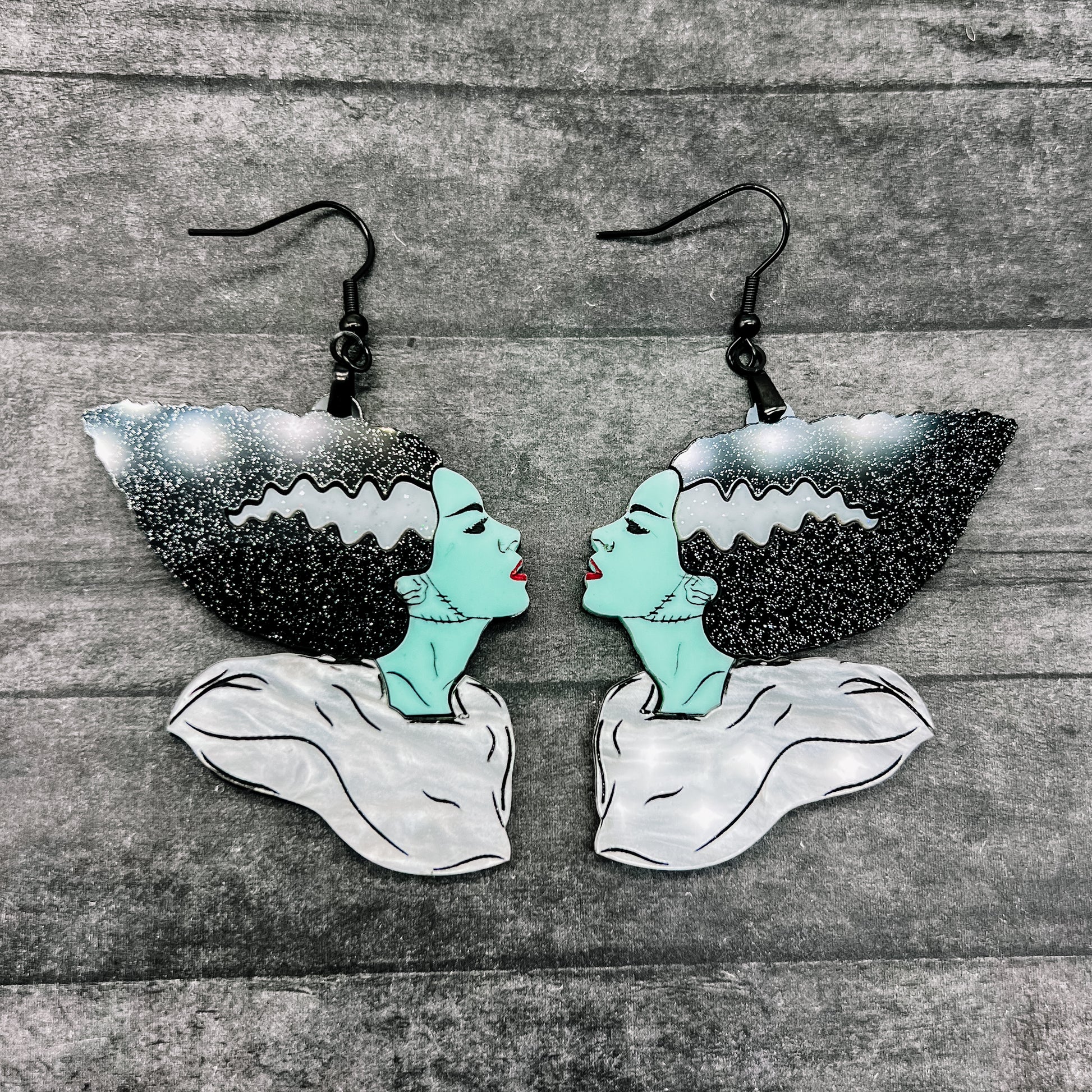 Bride of Frankenstein cut from various glossy and glittery acrylics! Paired with a green glitter lightning post.  These earrings are 2” long not including the hooks.