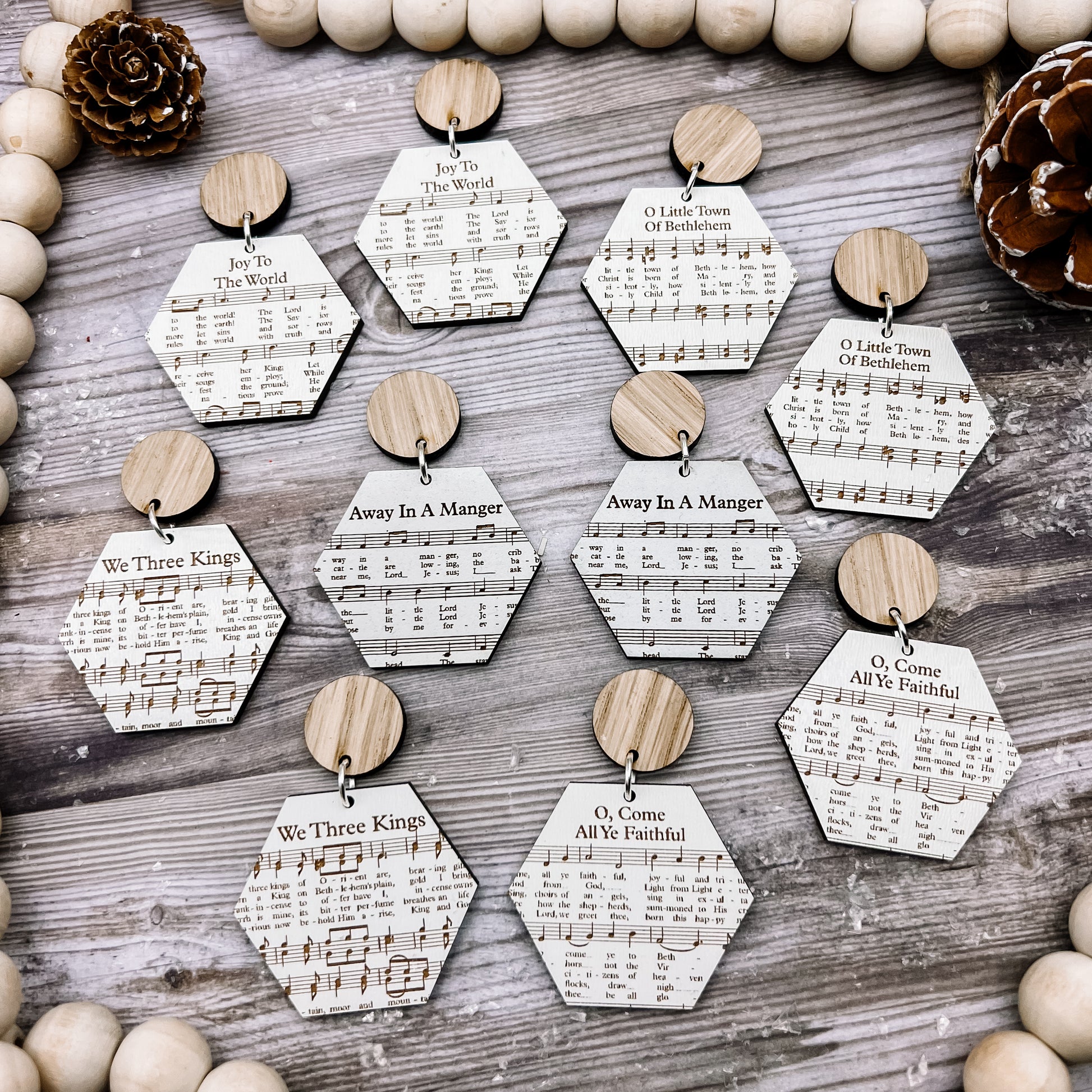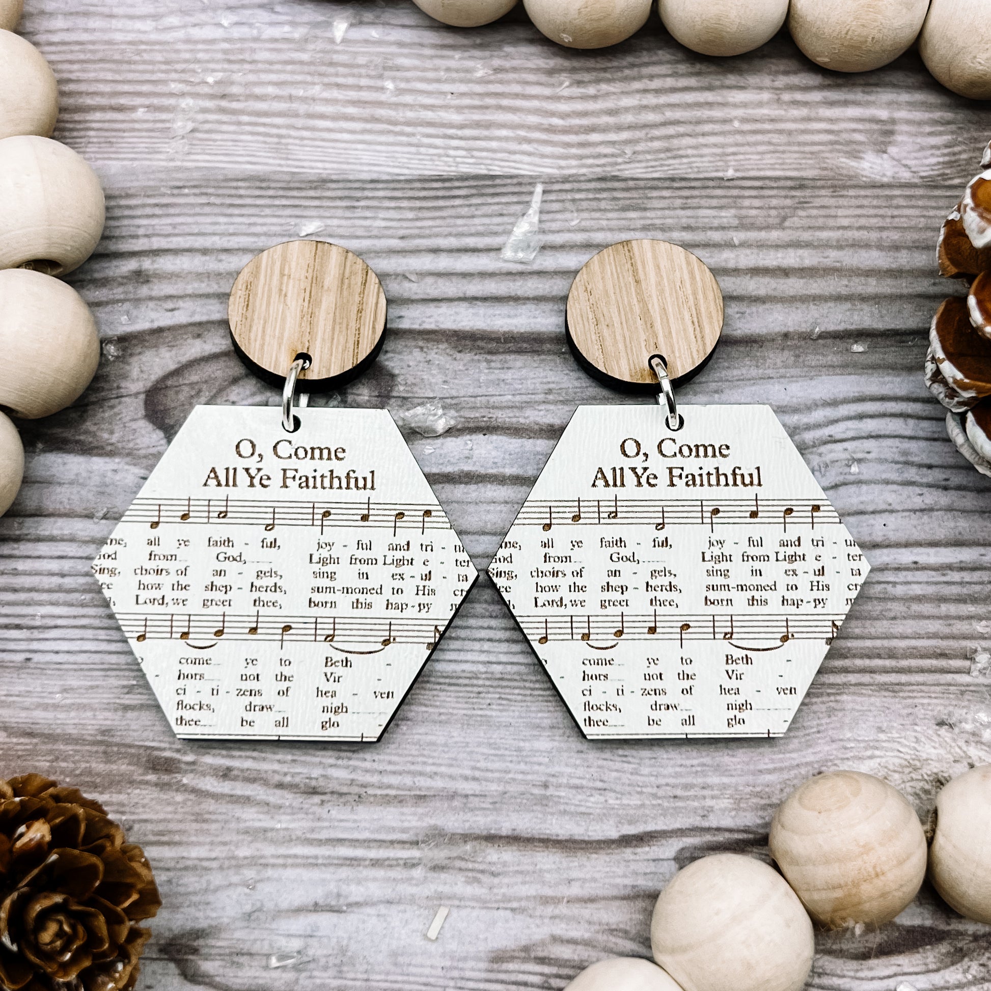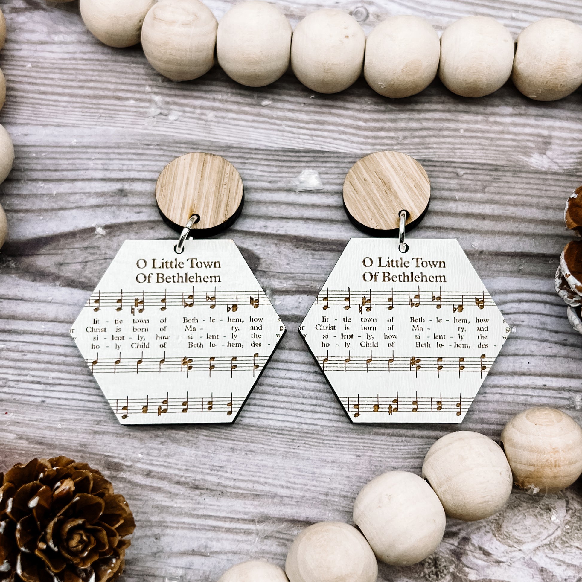 These ultra lightweight earrings measures 1.6” long not including the circle posts. It is made from 1/8” white board and 1/8” oak wood.