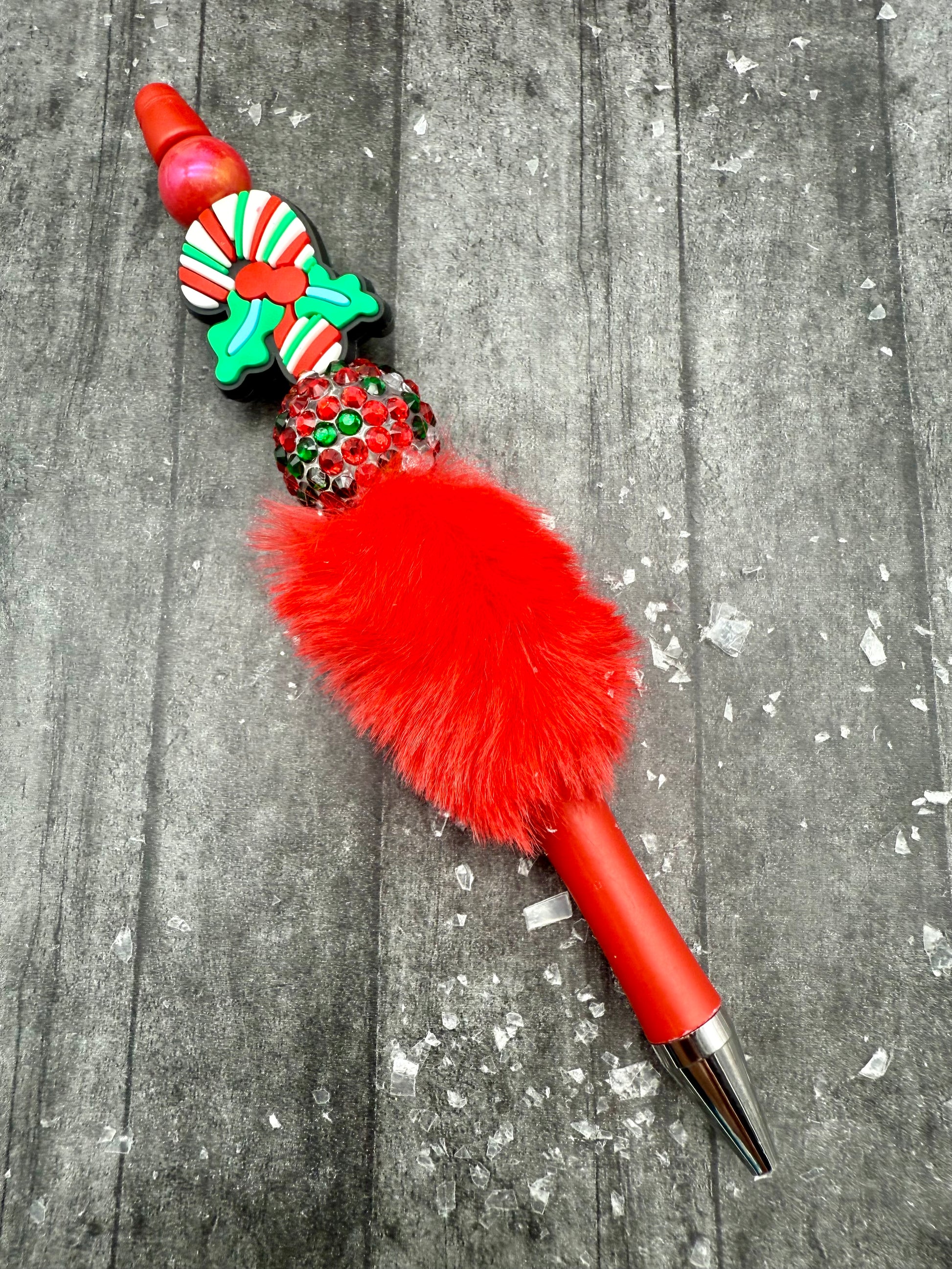 Beautiful red furry pens with traditional Christmas themed Focal beads.