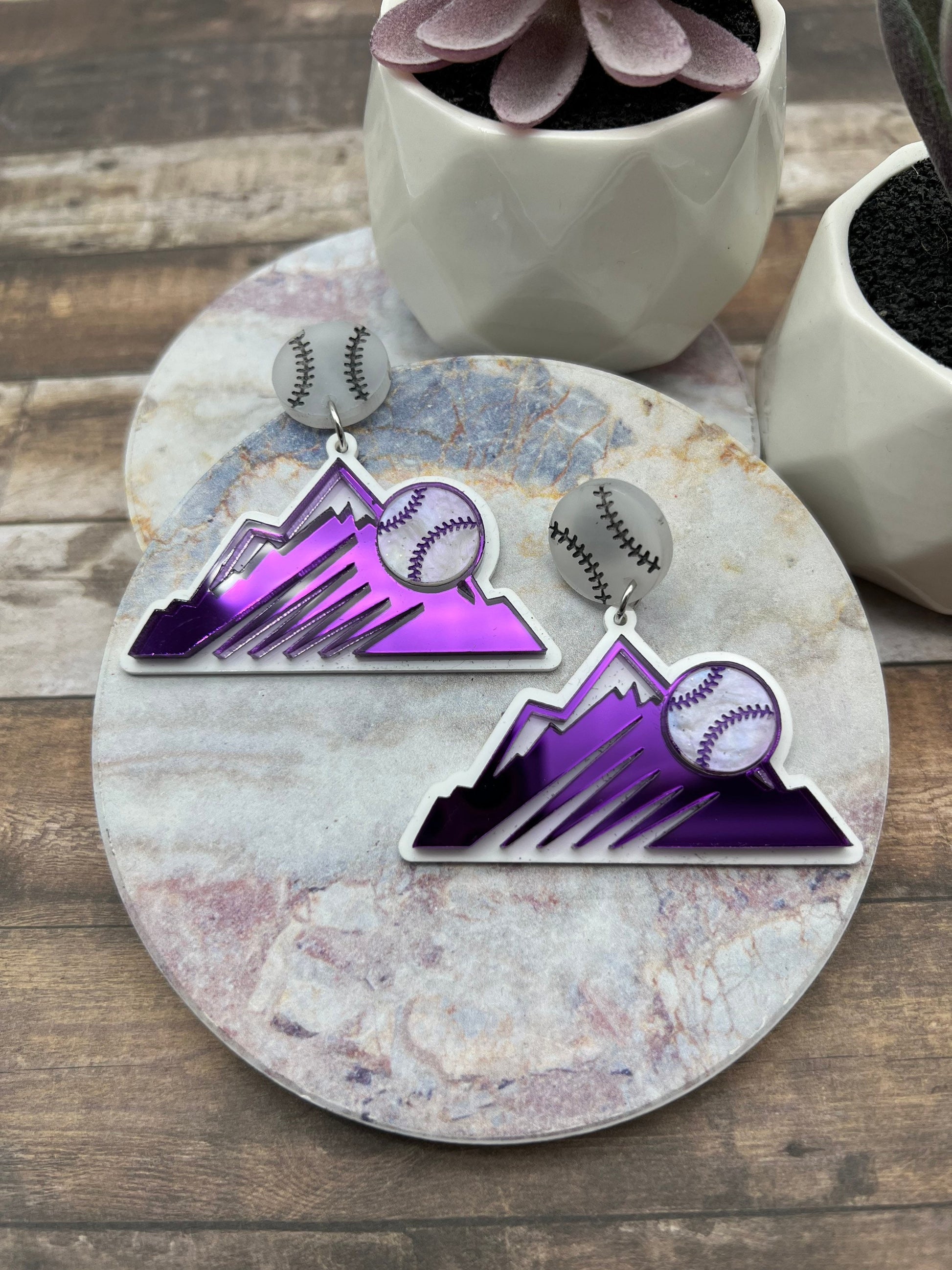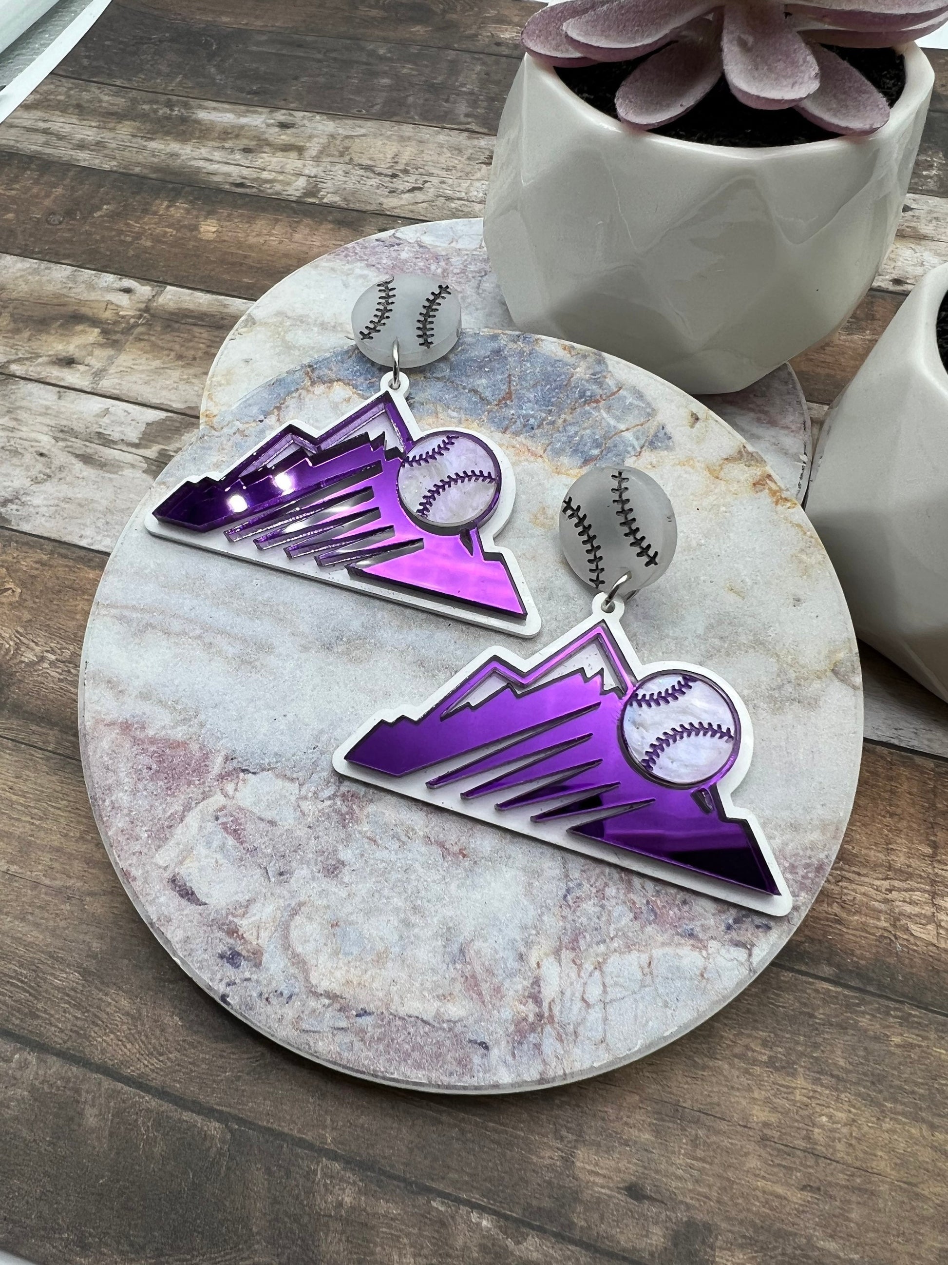 Show your Rockies team pride with these showstopper acrylic earrings! These earrings have a baseball earring post made from frosted white acrylic and the mountains are made from super reflective purple mirror acrylic!These earrings are very lightweight and the mountain piece measures 2.2 inches wide by 1.25” tall.