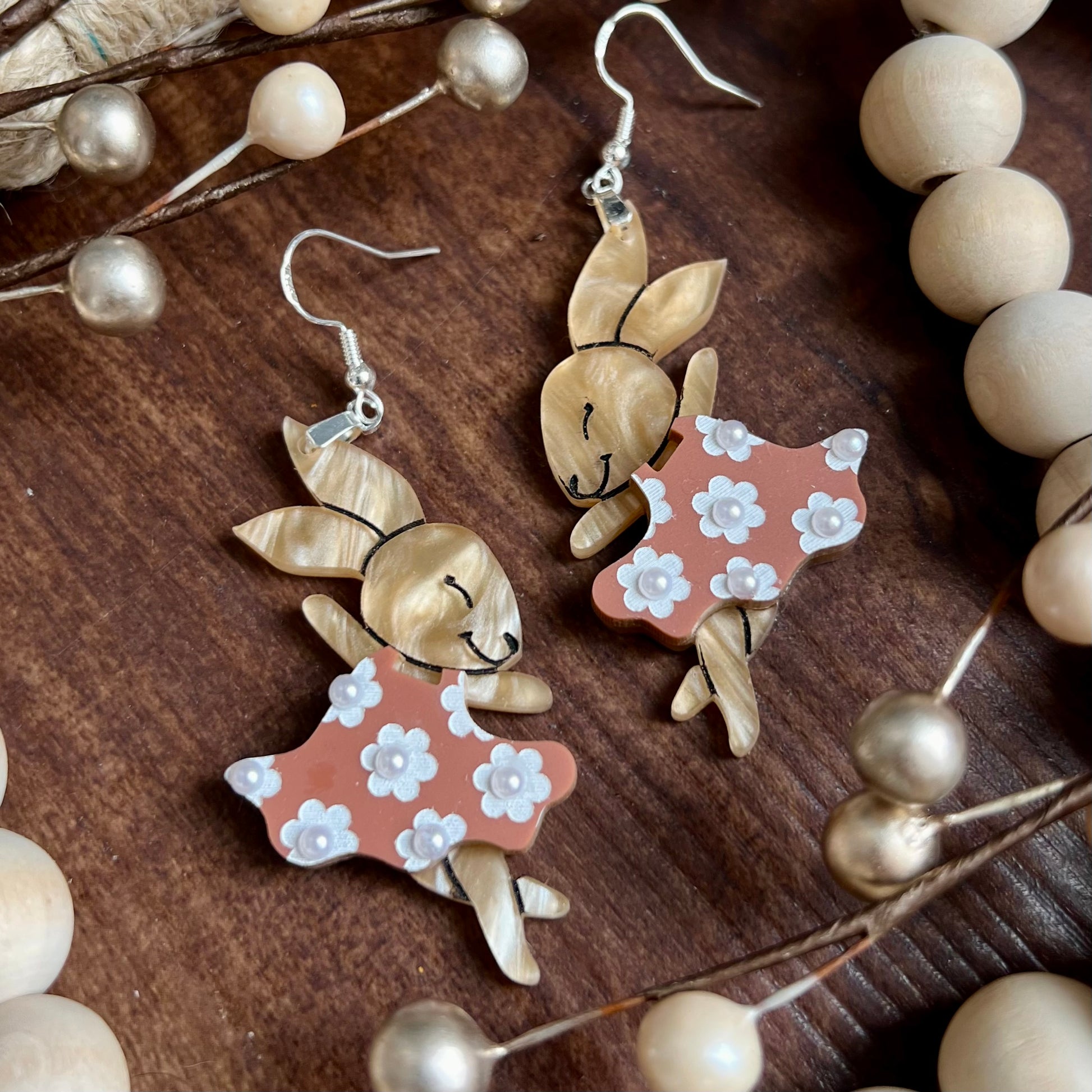 Your choice of brown or white marble bunnies with a coordinating dress color. Adorned with flat back pearls! Major boho/retro vibes with these! Perfect all spring and summer long!