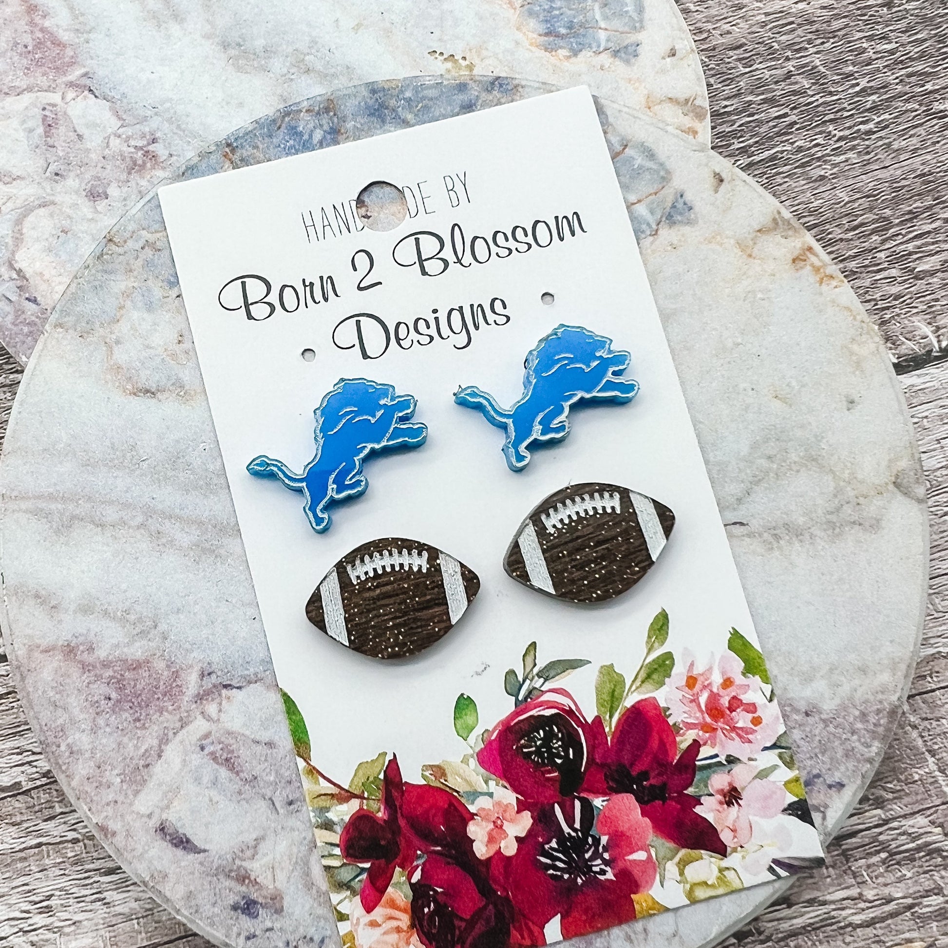 This listing is for TWO pairs of stud earrings. Lions logo cut, engraved, and hand painted from Blue acrylic. Football studs cut from a marbled glitter brown acrylic. Perfect for Detroit Lions game day!!