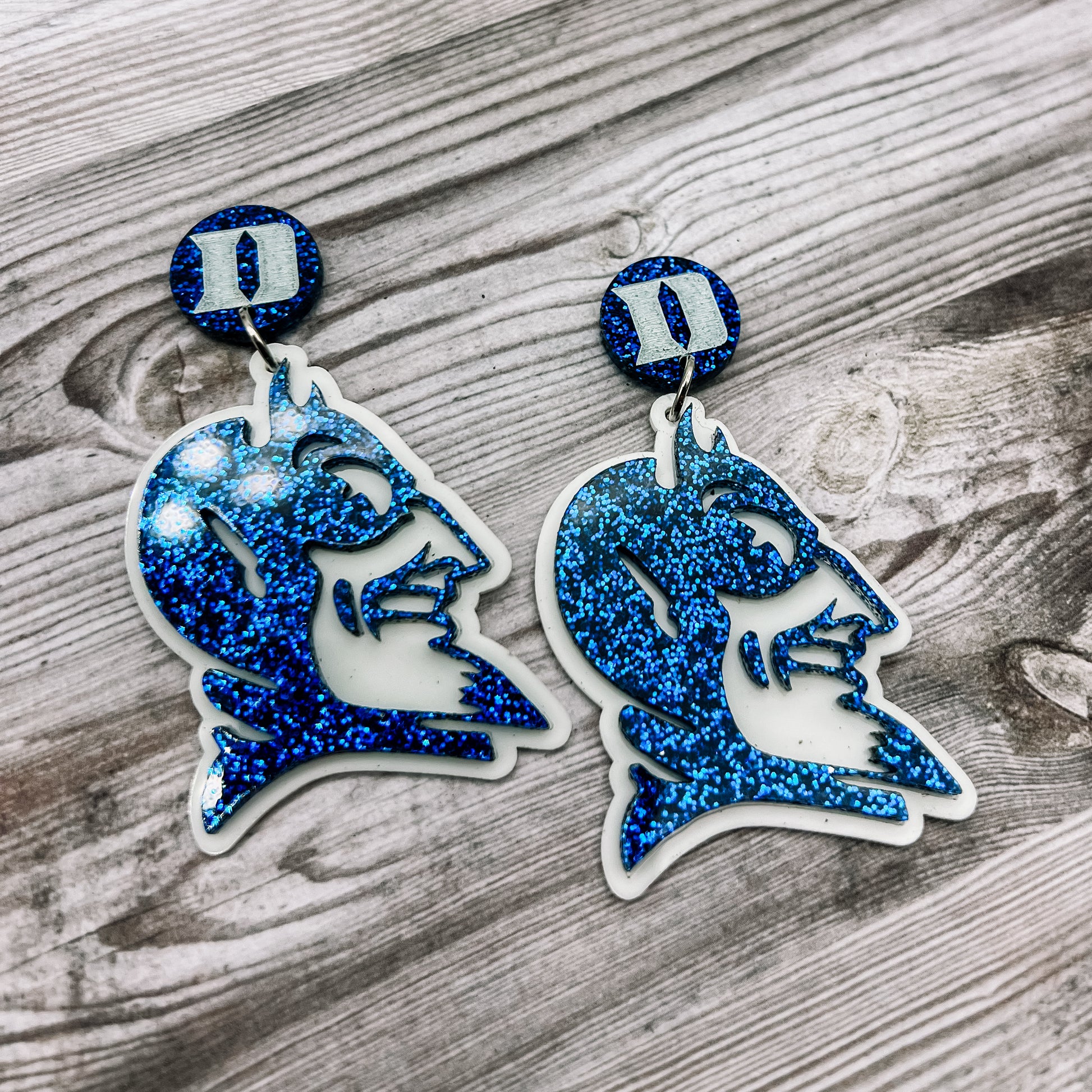Duke Blue Devil logos cut from blue glitter acrylic. Paired with a blue glitter circle post! Perfect for any Duke University student or alumni!