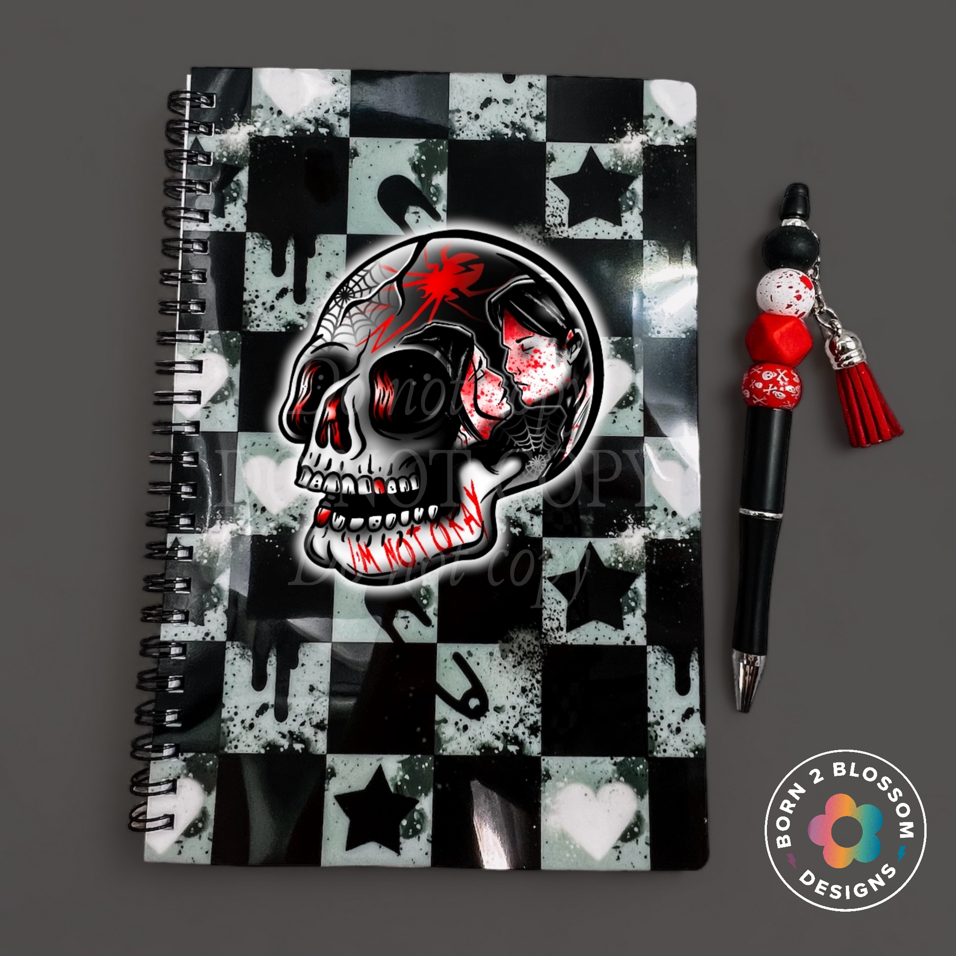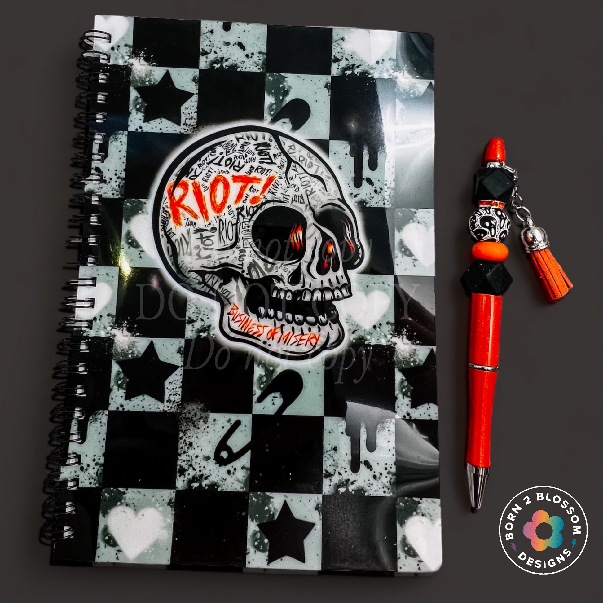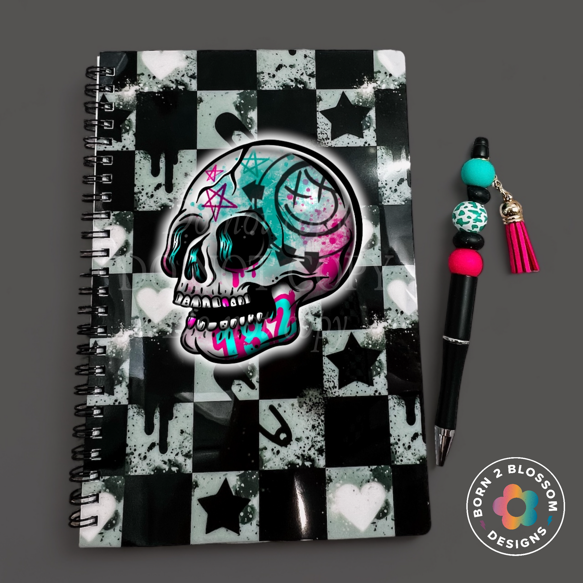 Emo Band inspired Skull Notebook with 60 blank pages and 5.5x8.5”. Includes a matching pen!