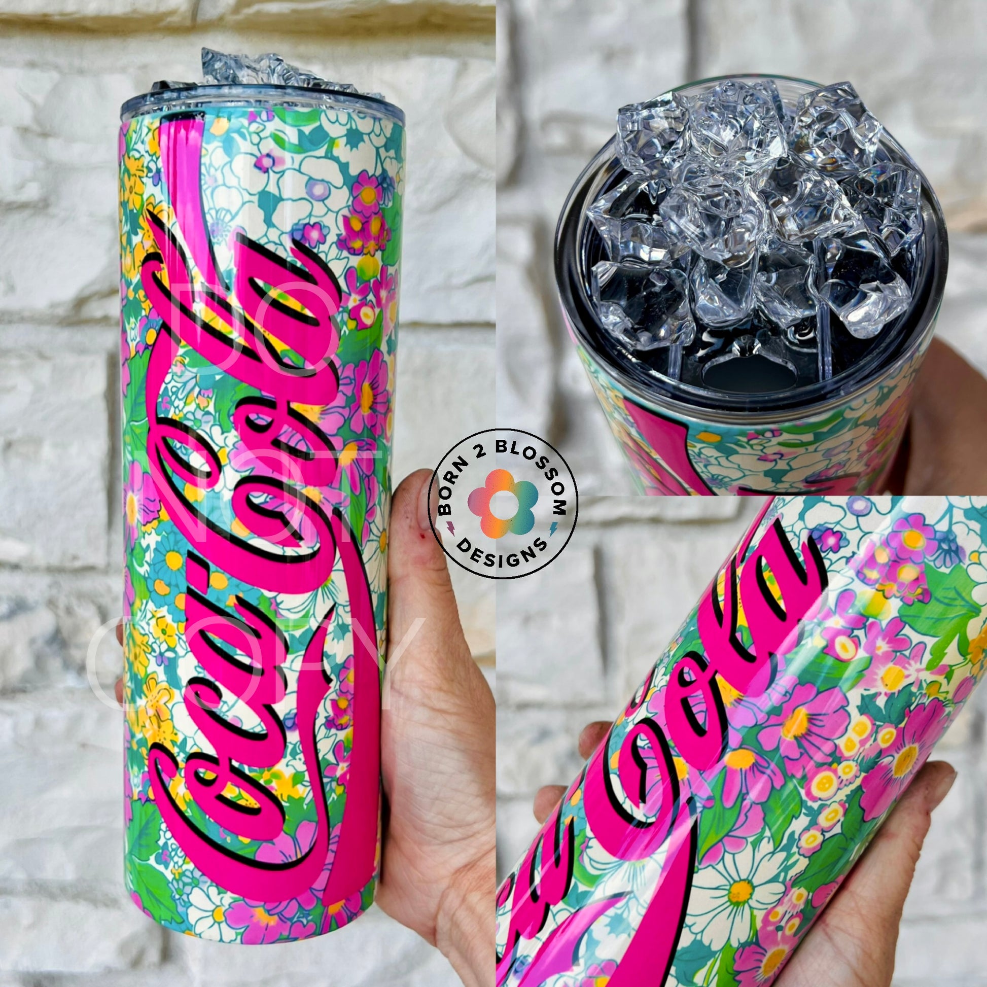 This is a sublimated tumbler featuring the Coke logo on a beautiful floral background. You have the option to upgrade to the faux ice lid!