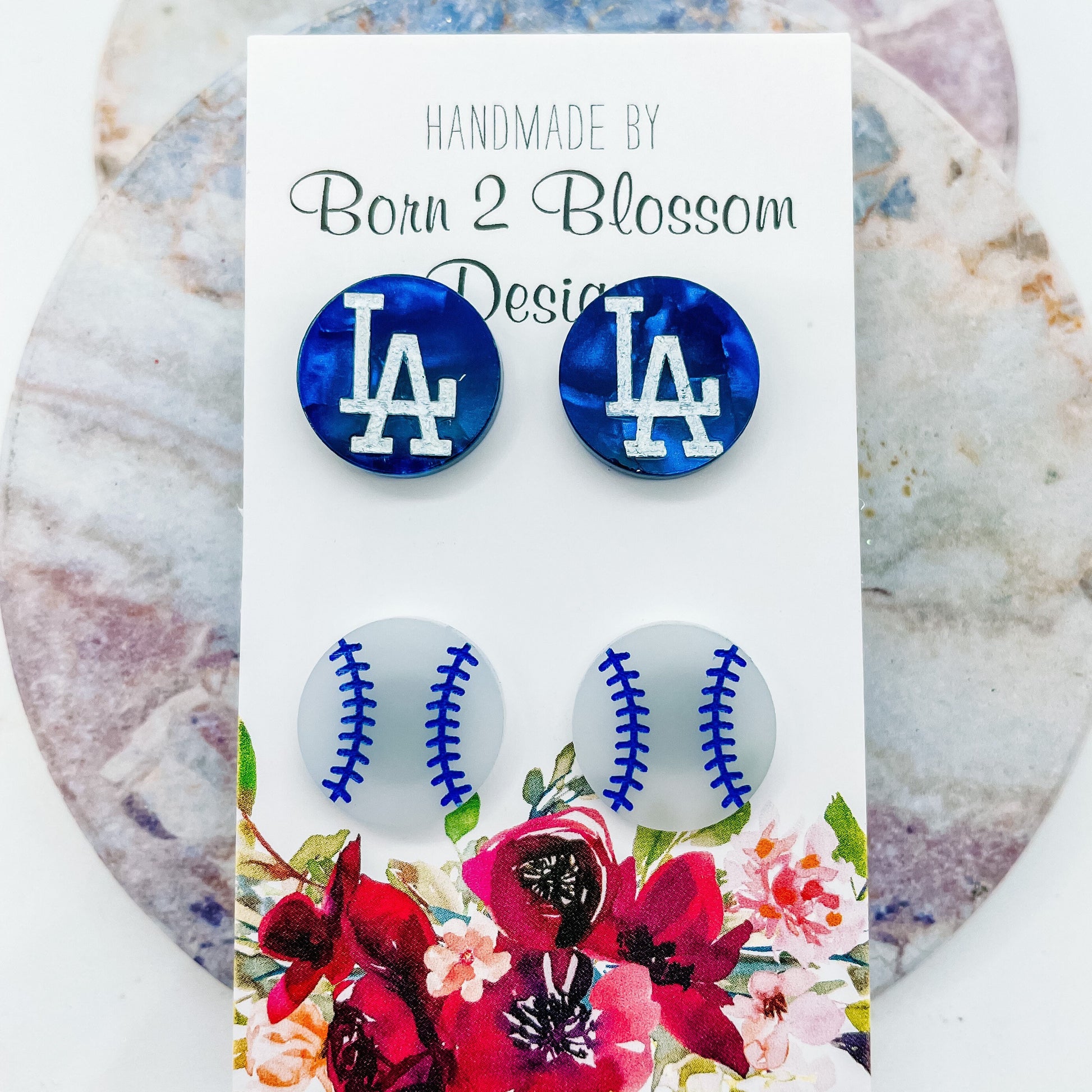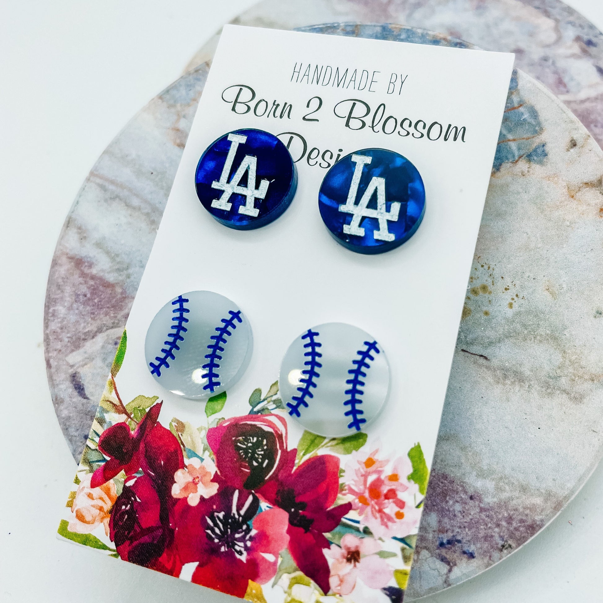 This listing is for TWO pairs of stud earrings. Dodgers logo cut, engraved, and hand painted from a gorgeous blue marble acrylic. Baseball studs cut from frosted white acrylic. Perfect for Dodgers and LA sports fans!!These ultra lightweight earrings measure .65 inches in diameter and have a push back.