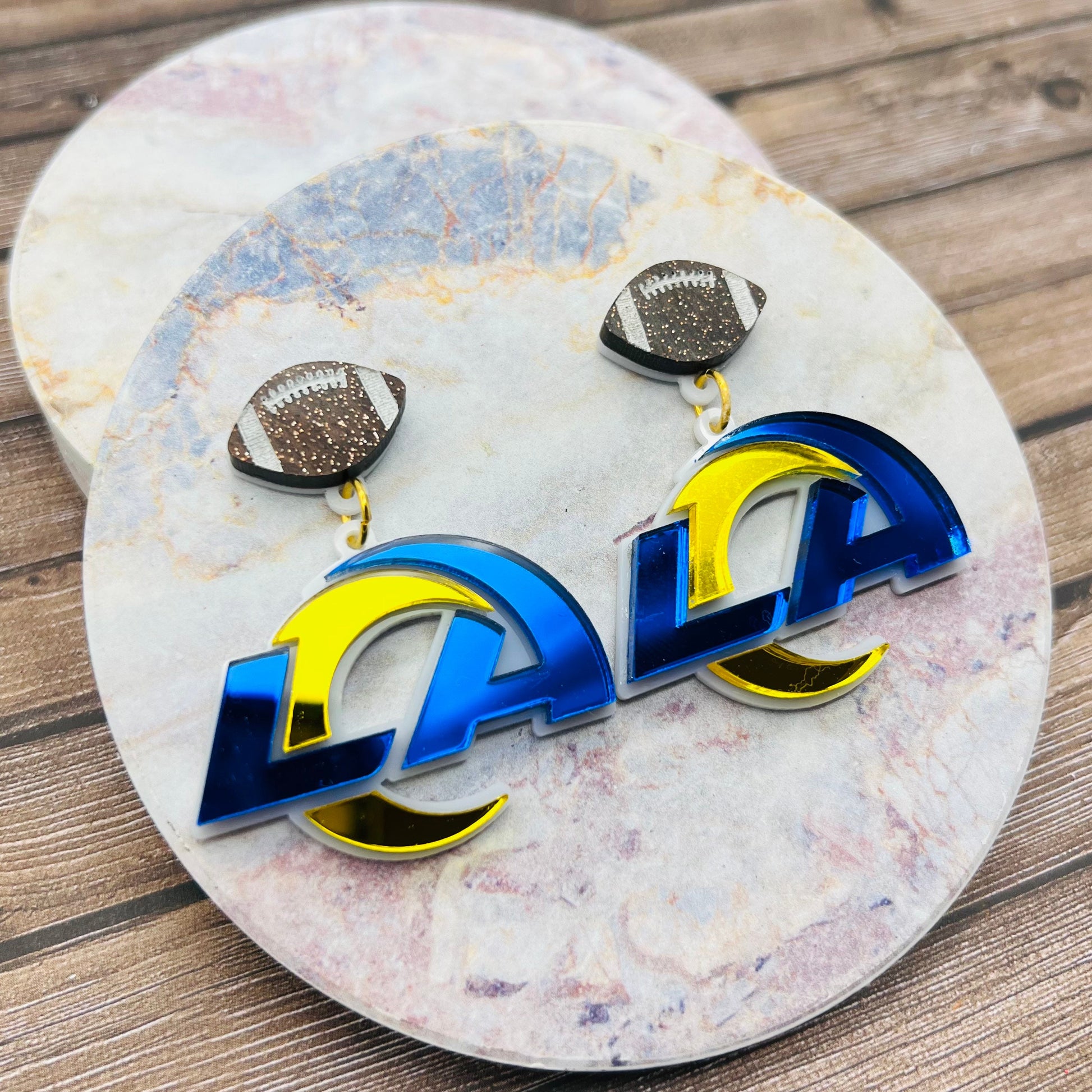 Show your Rams team pride with these showstopper acrylic earrings! These earrings have a football earring post made from sparkly brown acrylic and the LA logo is made from blue and yellow mirror acrylic! Celebrate that big Super Bowl win with these gorgeous dangles! Who’s house? Rams house!