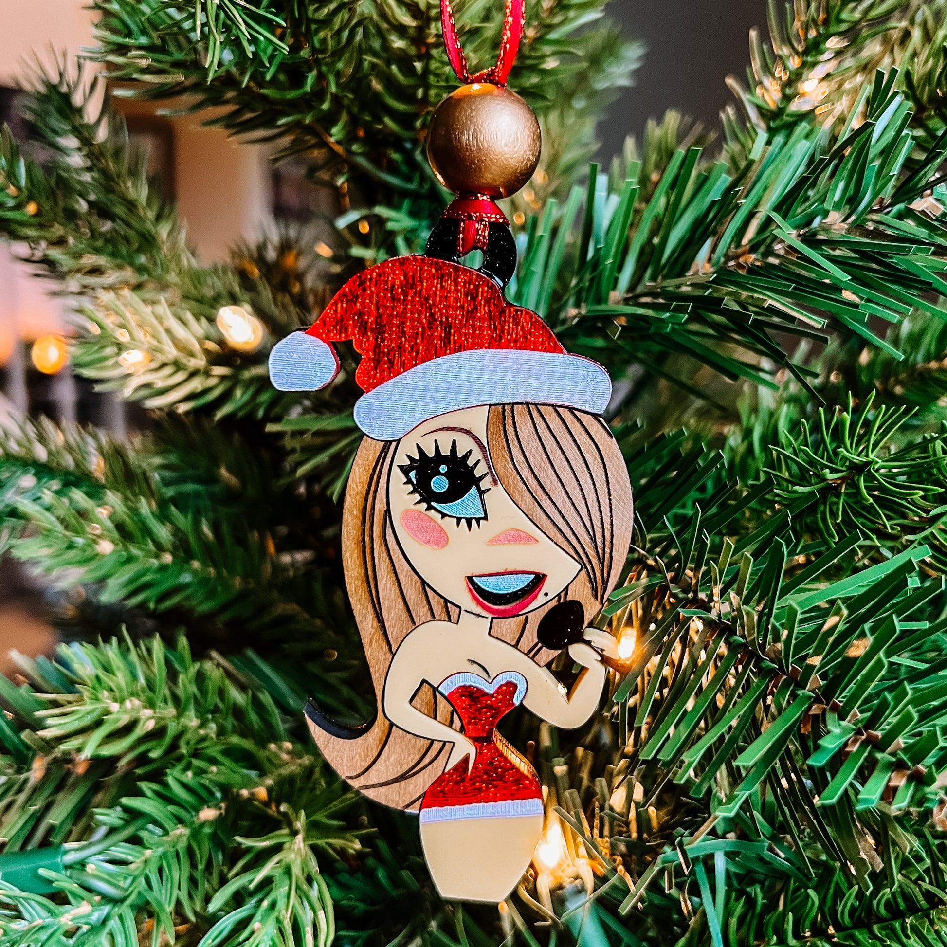 A beautiful sparkly Mariah Carey ornament made from various laser cut acrylics!