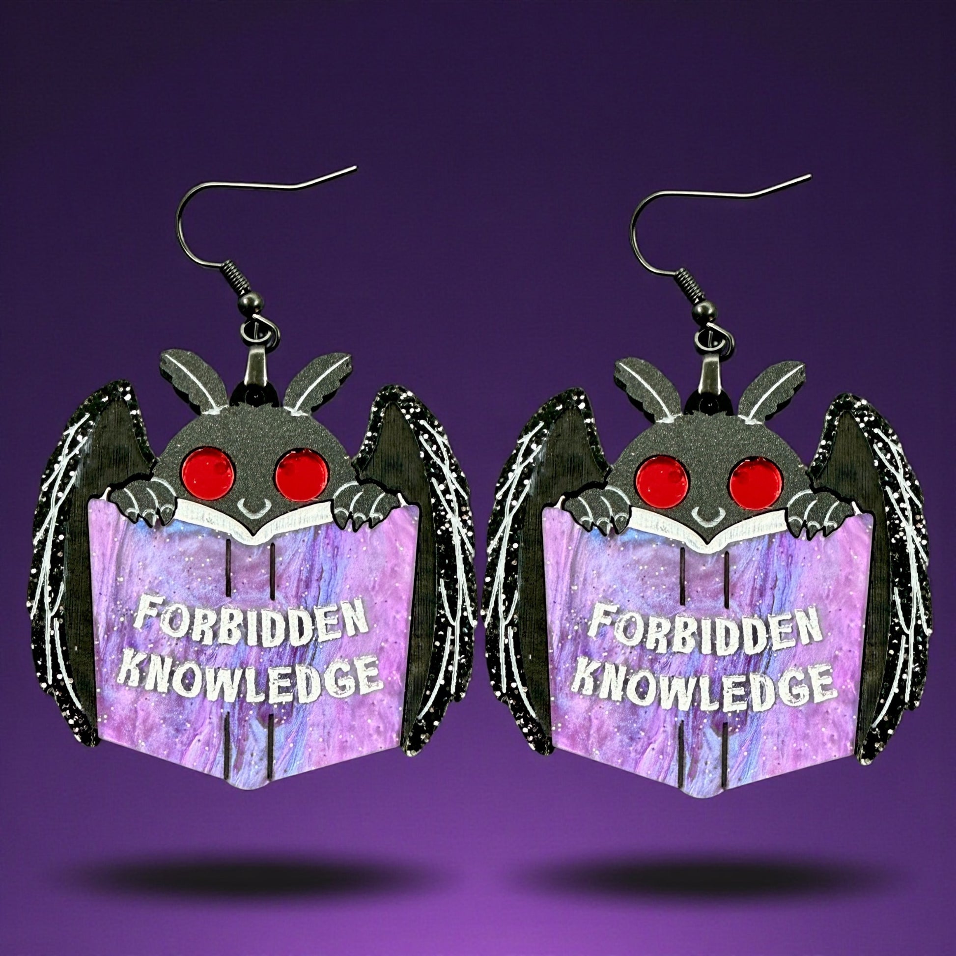 An adorable little mothman peeking over your choice of ‘Forbidden Knowledge’ or Shel Silverstein’s ‘A Light in the Attic’. Cut from a black glitter and purple acrylic.