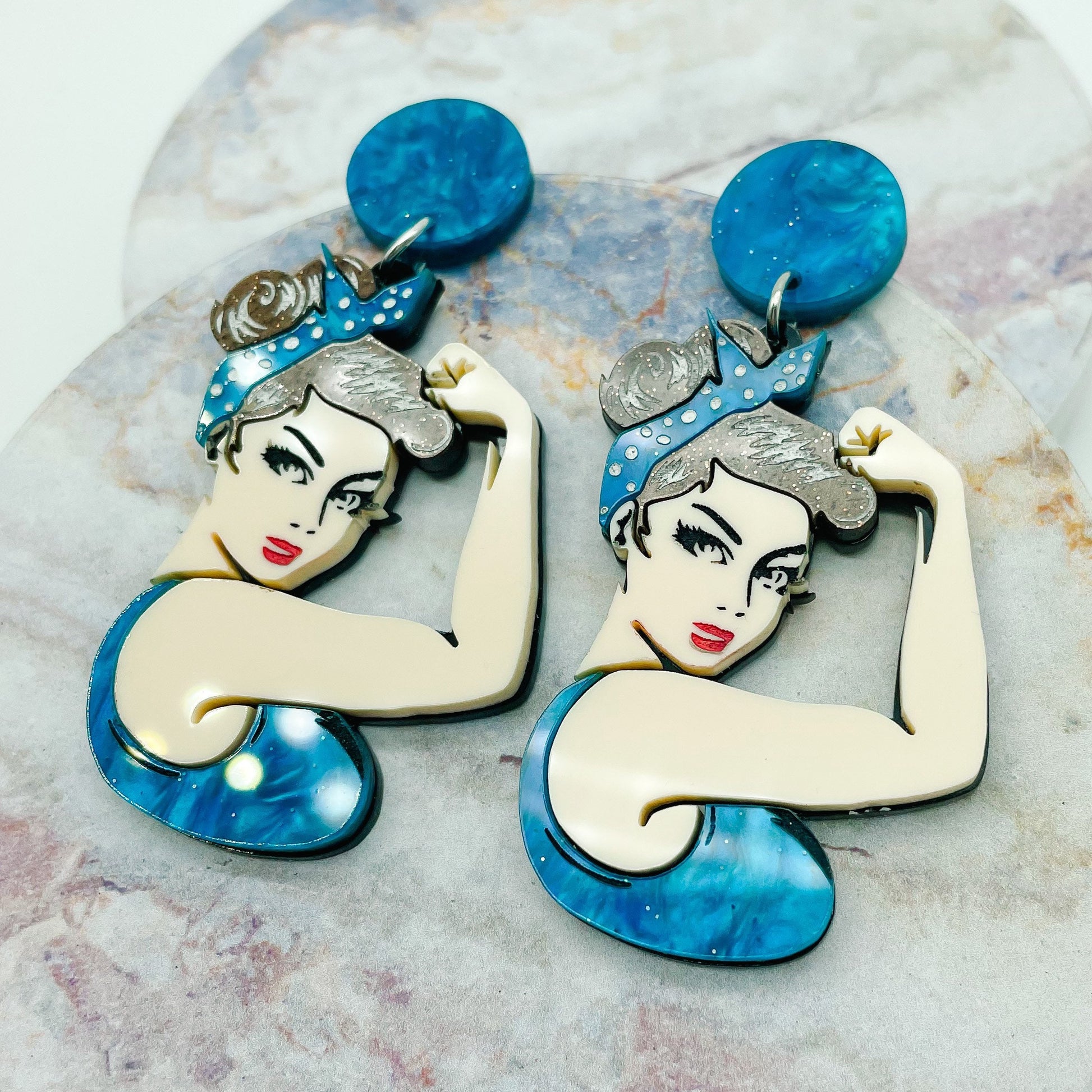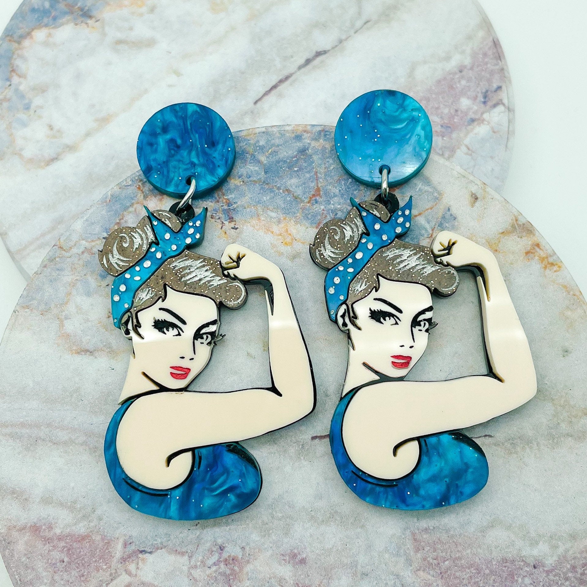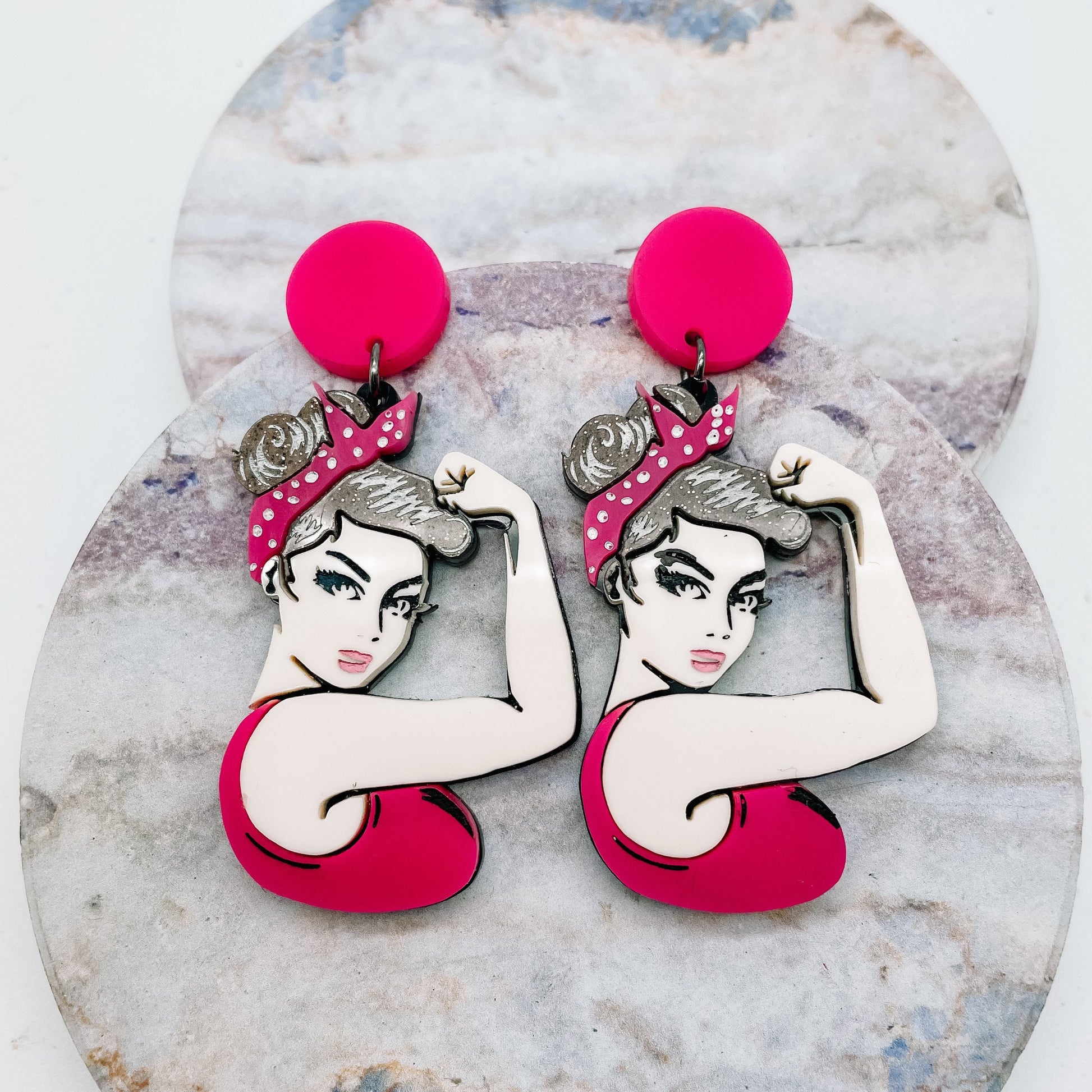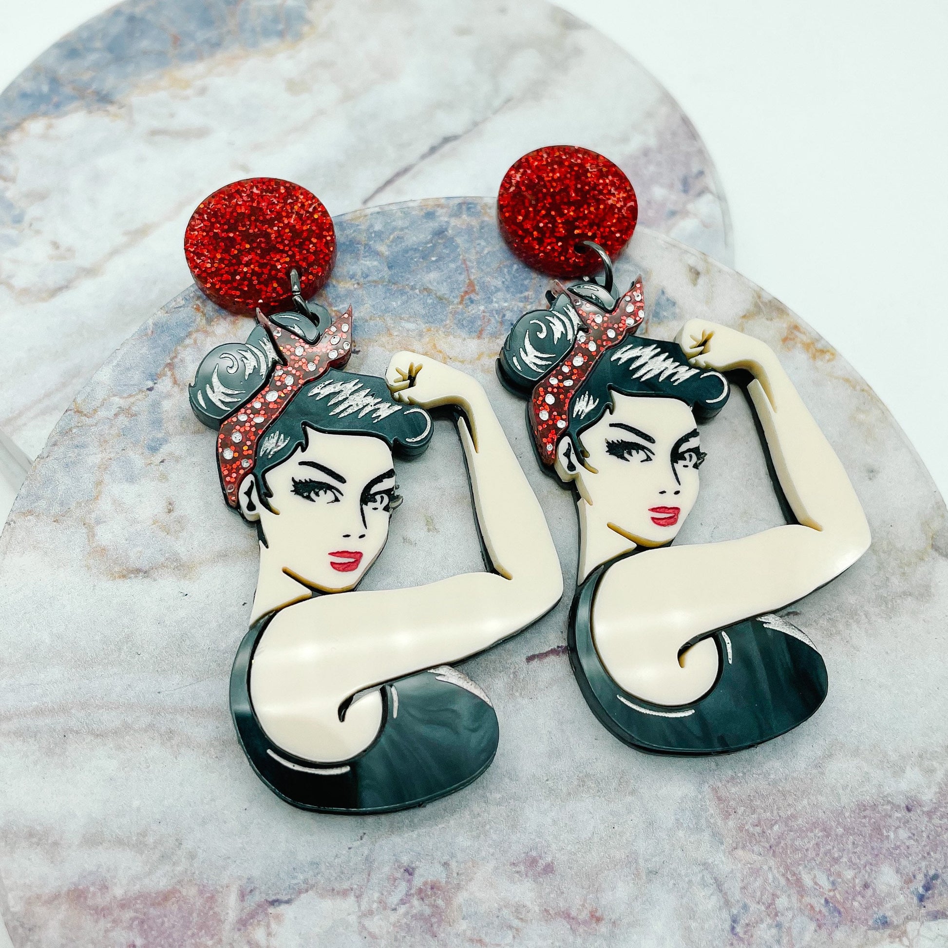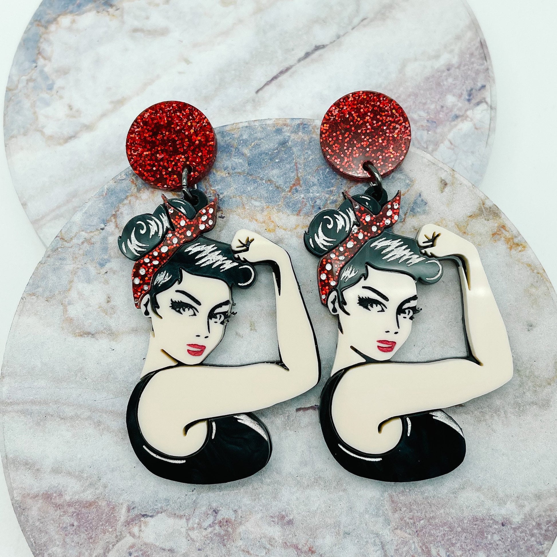 Rosie the Riveter acrylic earrings! These intricate earrings are made from laser cut and engraved acrylics! Every color is a different piece of acrylic! 😱 Great showstoppers!