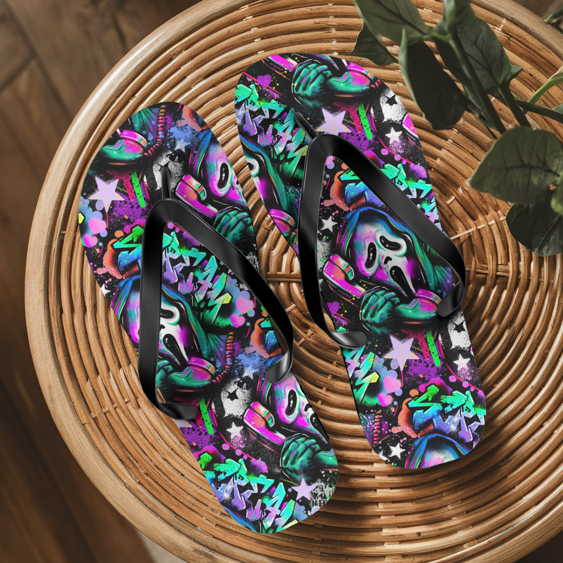 Sublimated unisex flip flops with a Scream graffiti style design!