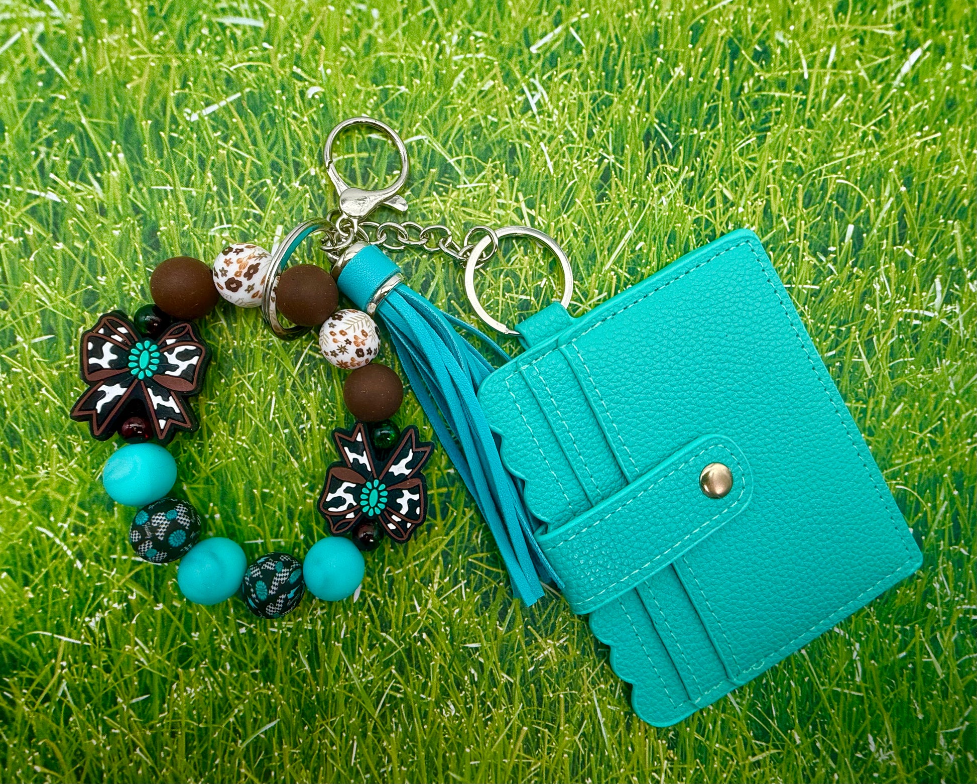 Cute beaded wristlet bracelet has standard keychain hardware, either in zinc alloy gold finish or silver finish. See photo for specific metal color. An ID wallet (on most, see photos) has been added along with the wristlet and keychain.  These wristlet combinations are perfect for when you're on the go and don't want to carry a huge purse. The wallets have multiple card slots, an ID window (on most of them) and some come with a zipper pocket for coins or cash. They do vary in size (3-4” by 4-6”) and orientation. See photos for specific details of each set.
